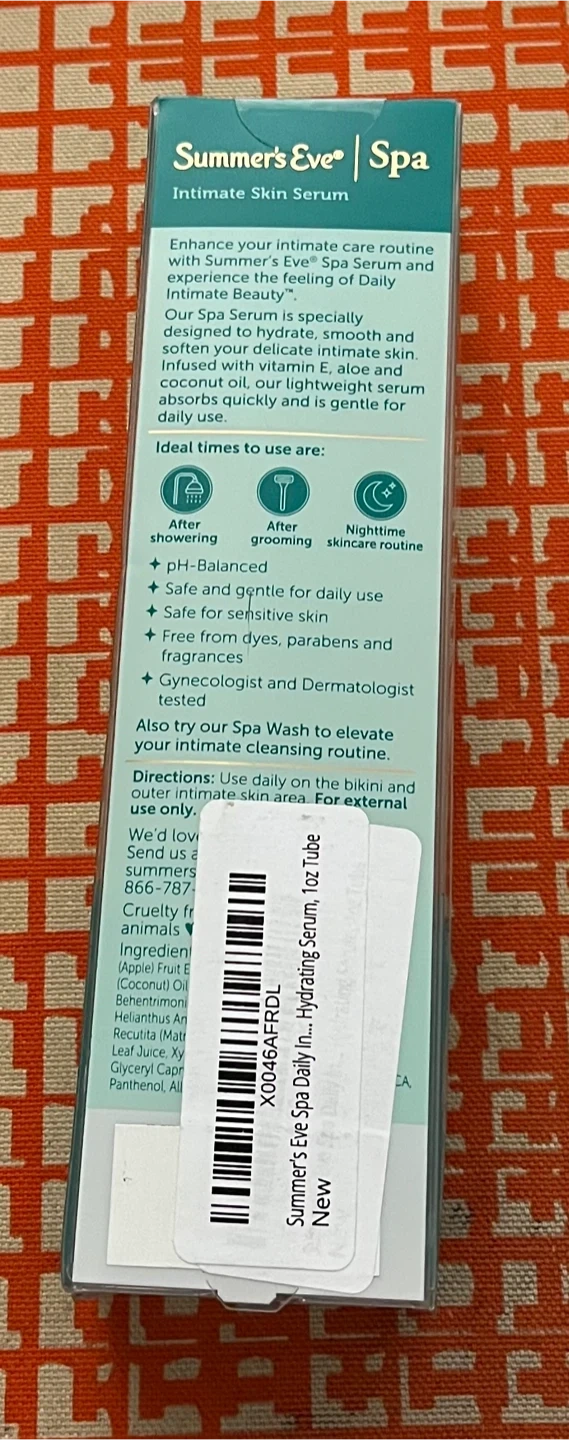 This Summer's Eve Spa Serum is designed to hydrate, smooth, and soften intimate skin. It's infused with Vitamin E, Aloe, and Coconut Oil, absorbing quickly and being gentle for daily use. Safe for sensitive skin and free from dyes, parabens, and fragrances. Gynecologist and Dermatologist tested!