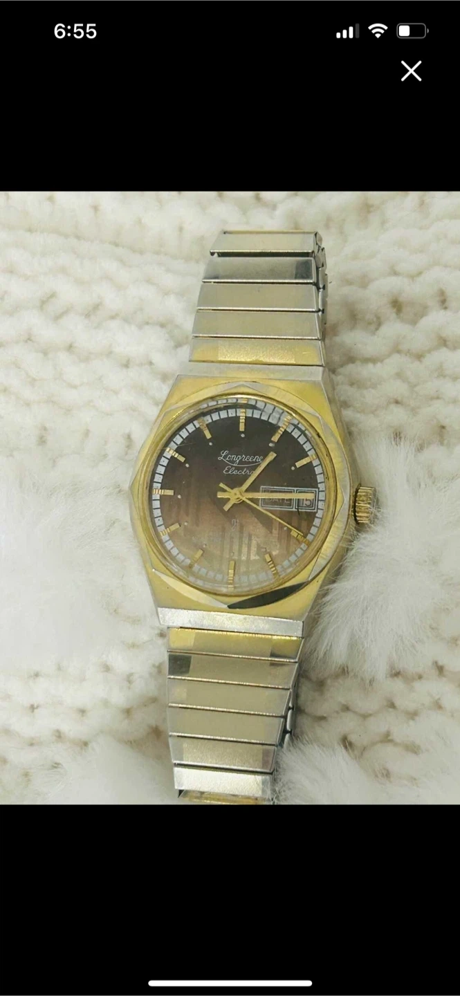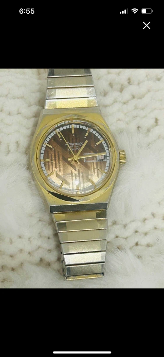Rare Timeless vintage Longreene quartz Electric Automatic wristwatch. Gold band case and Brown dial. Day and date functions. Swiss made in perfect working condition runs beautifully. Selling for less than others see photos and in perfect condition