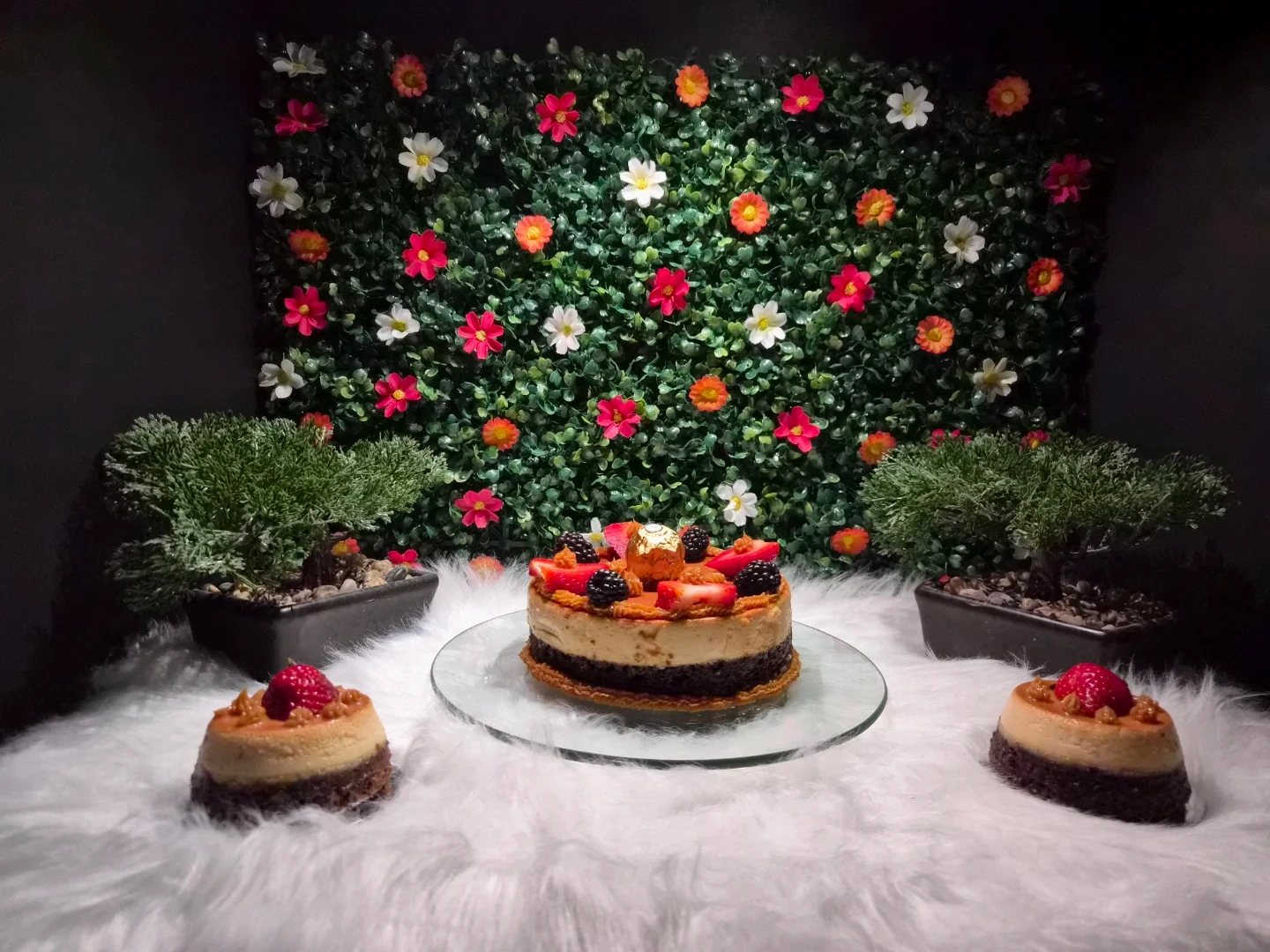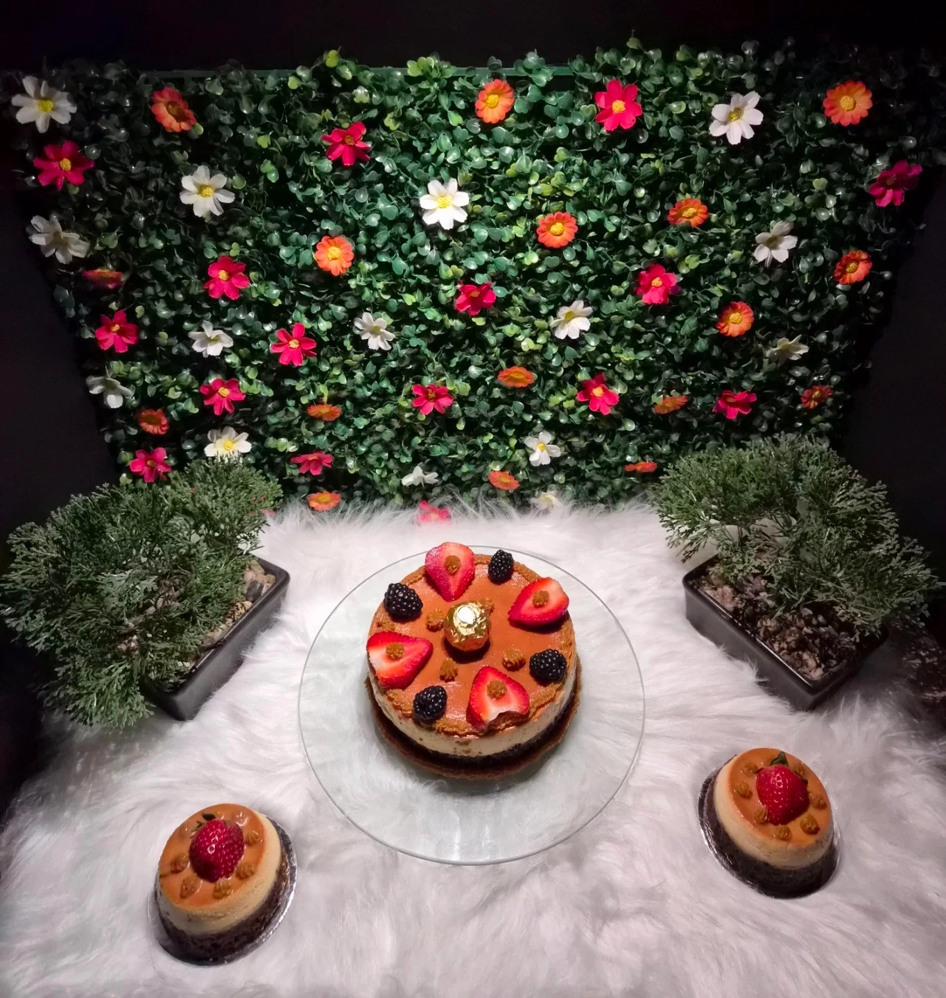 A delicious chocoflan topped with fresh strawberries, blackberries, and a swirl of caramel. The individual mini chocoflan also topped with fruit. Perfect for a special occasion or a sweet treat! ๐