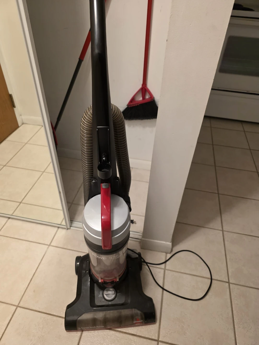 This is a Bissell PowerForce upright vacuum cleaner. It features a bagless dust cup and a swivel steering design for easy manoeuvring. The vacuum includes a brush roll for carpet cleaning.
