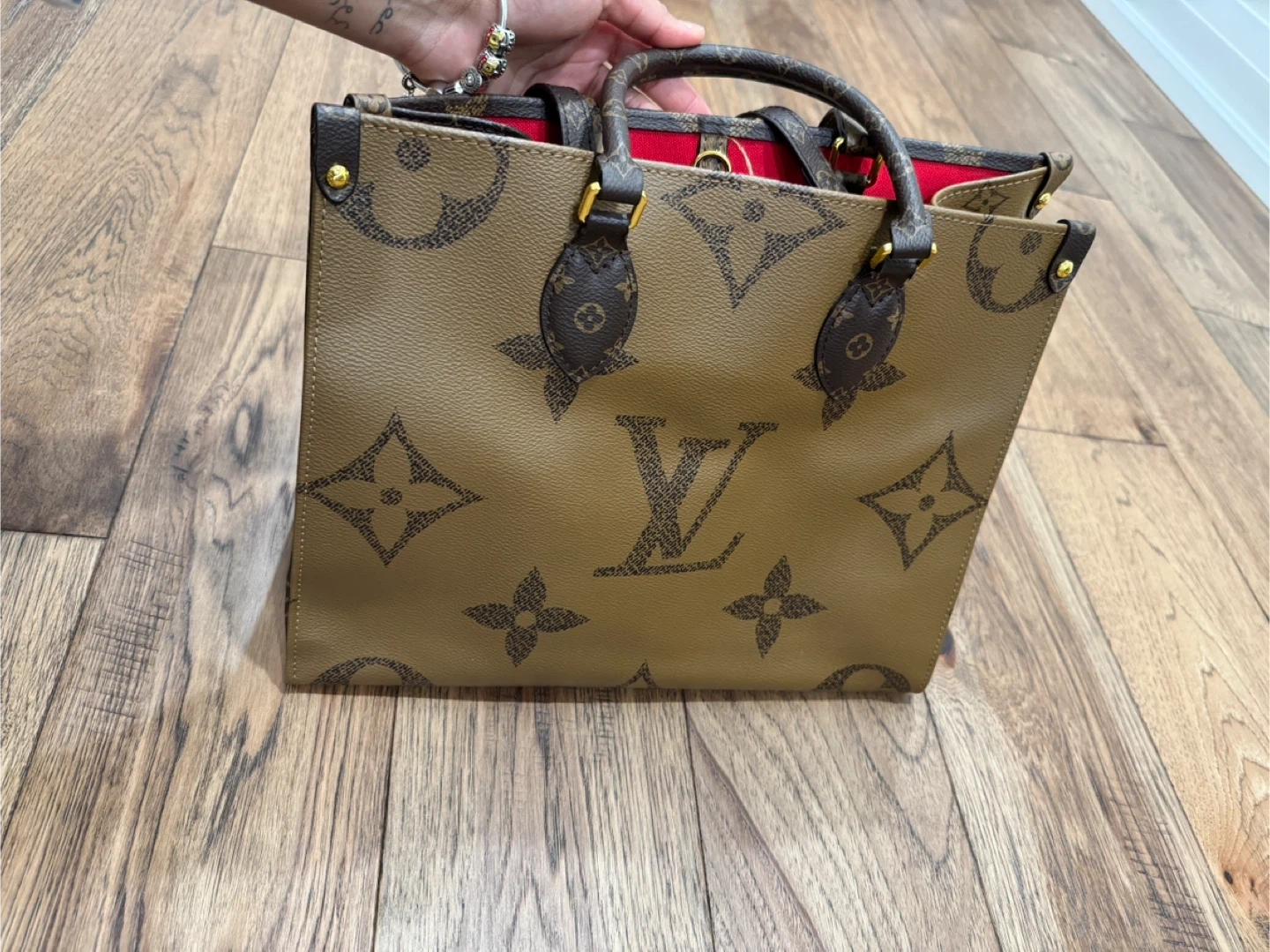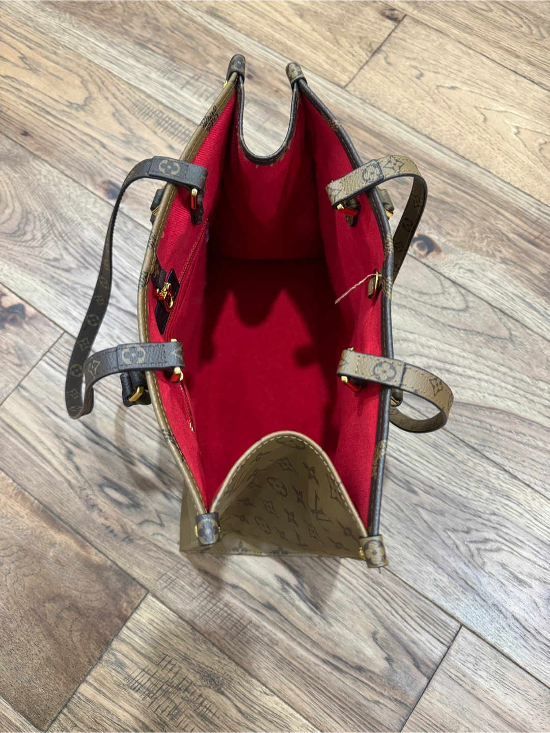 This is a Louis Vuitton tote bag featuring the iconic monogram canvas. It has a spacious red interior and leather handles. This bag is perfect for everyday use, offering both style and functionality. Specially for those whom wants to use for dailylife and wants to look elegant.