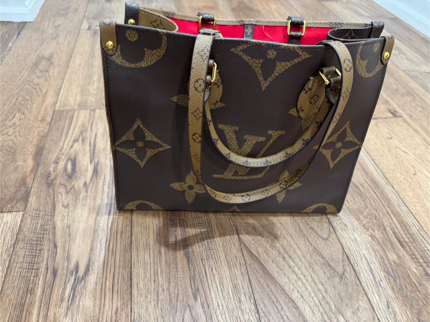 This is a Louis Vuitton tote bag featuring the iconic monogram canvas. It has a spacious red interior and leather handles. This bag is perfect for everyday use, offering both style and functionality. Specially for those whom wants to use for dailylife and wants to look elegant.