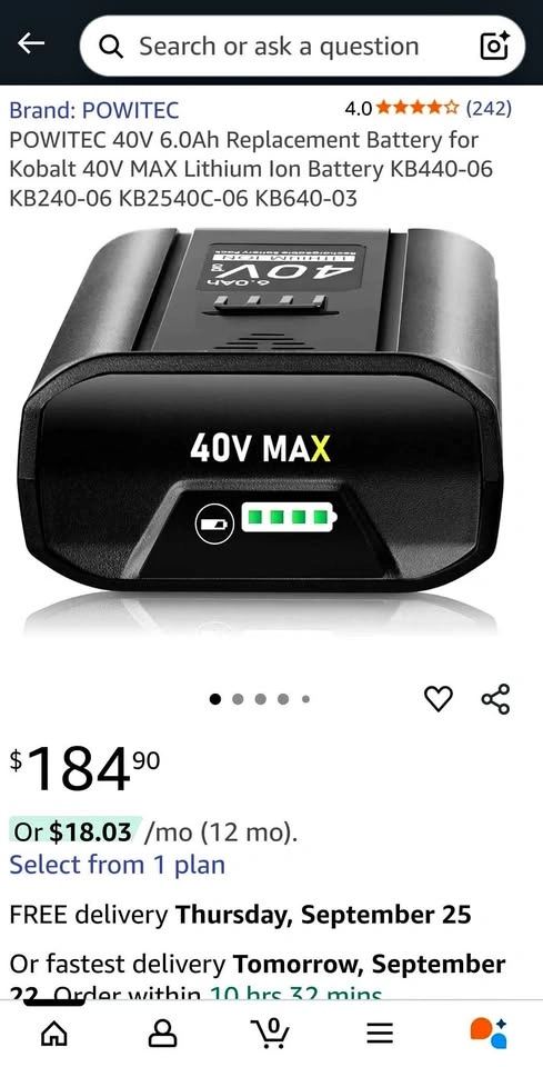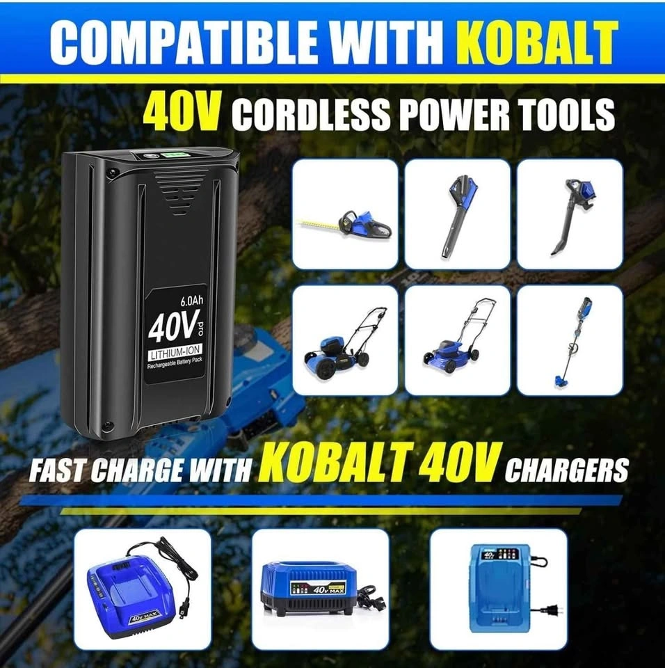 70Brand new 40V 6.0Ah Replacement Battery. Compatible with Kobalt 40V MAX Lithium-Ion tools. Works with models: KB440-06, KB240-06, KB2540C-06, KB640-03. Pickup in Oakville