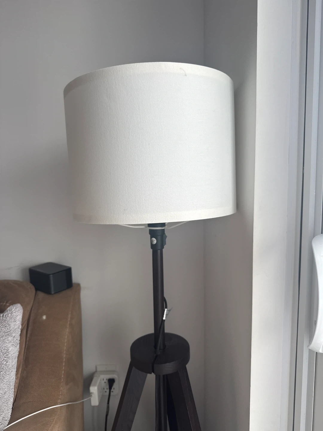 This floor lamp features a modern tripod base and a clean white drum shade. Its dark wood-toned legs complement the neutral shade, providing warm ambient light. It's perfect for adding a stylish lighting element to any room. The shade is fabric, and the base is wood.