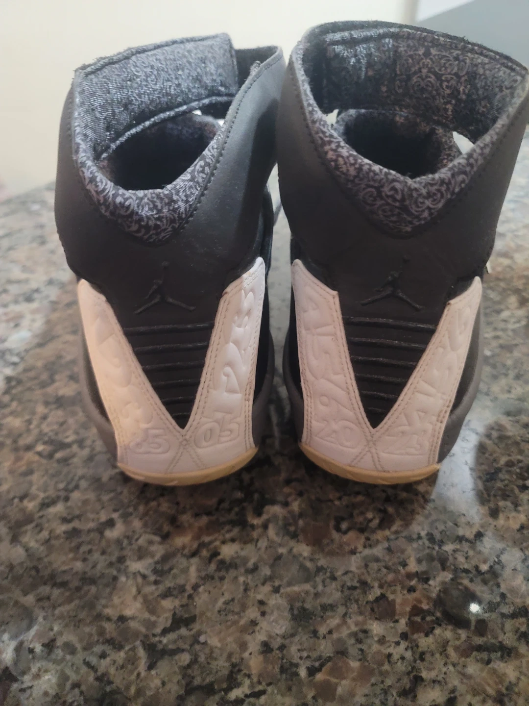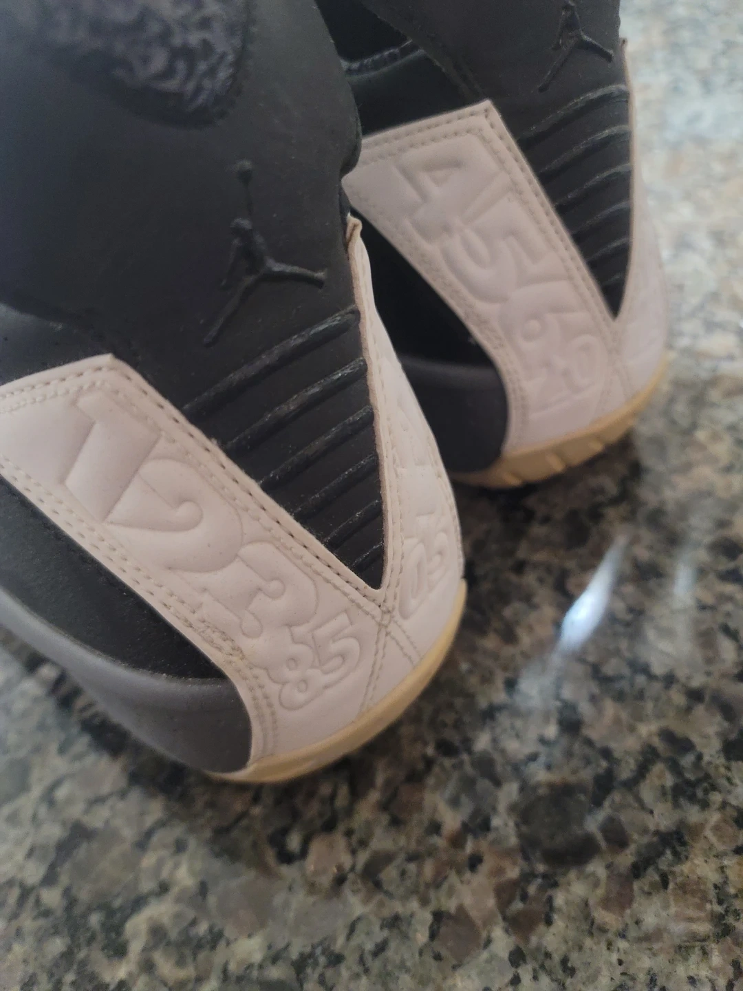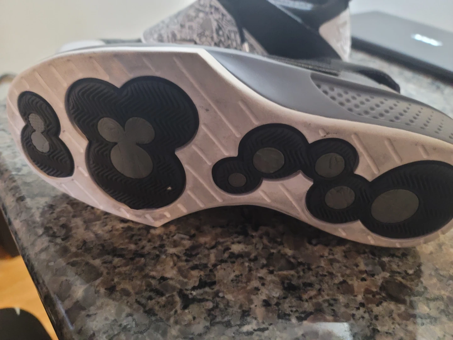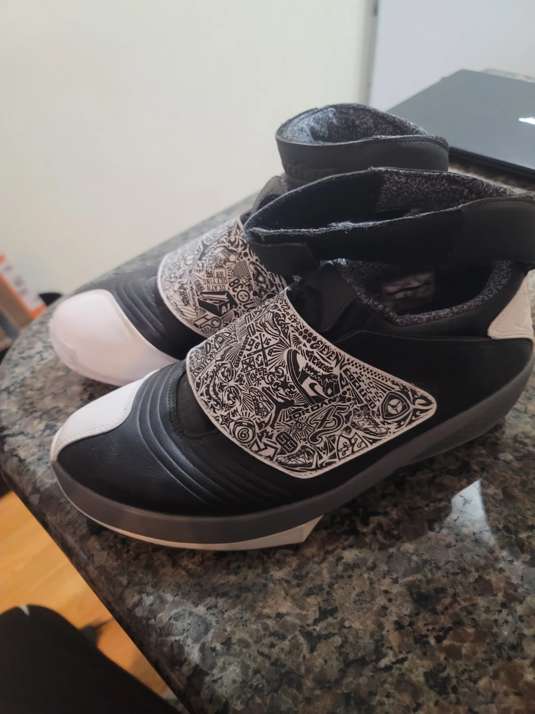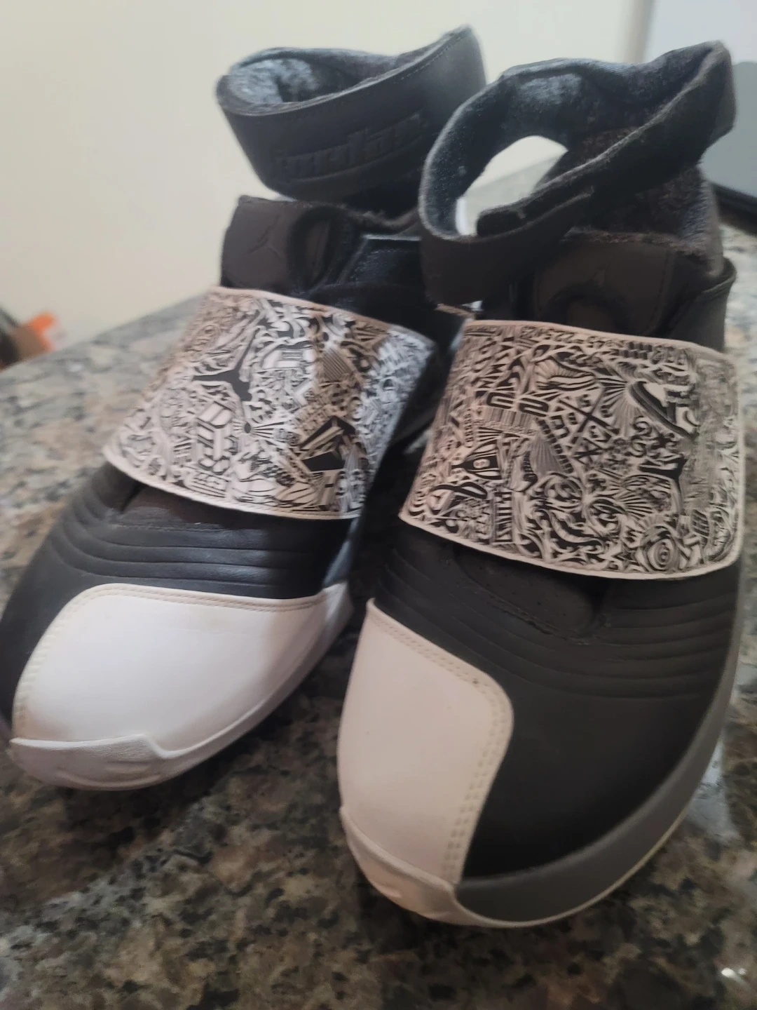 Black and white Air Jordan 23 sneakers with intricate graphic detailing on the midfoot strap and heel accents. It's got a mid-top silhouette and a durable rubber sole. These shoes are great for collectors! No Box. P/U only.