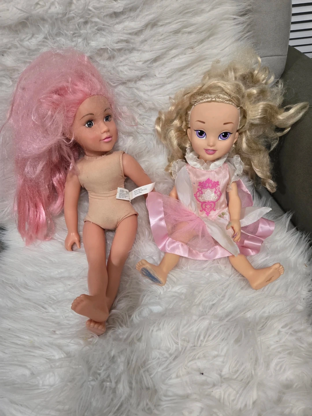 Two dolls looking for a new home! One has pink hair and a nude-coloured body suit. The other has blonde curly hair and a pink and white dress. They've been gently played with and are ready for more adventures