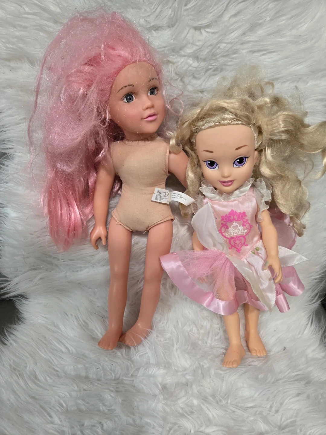 Two dolls looking for a new home! One has pink hair and a nude-coloured body suit. The other has blonde curly hair and a pink and white dress. They've been gently played with and are ready for more adventures