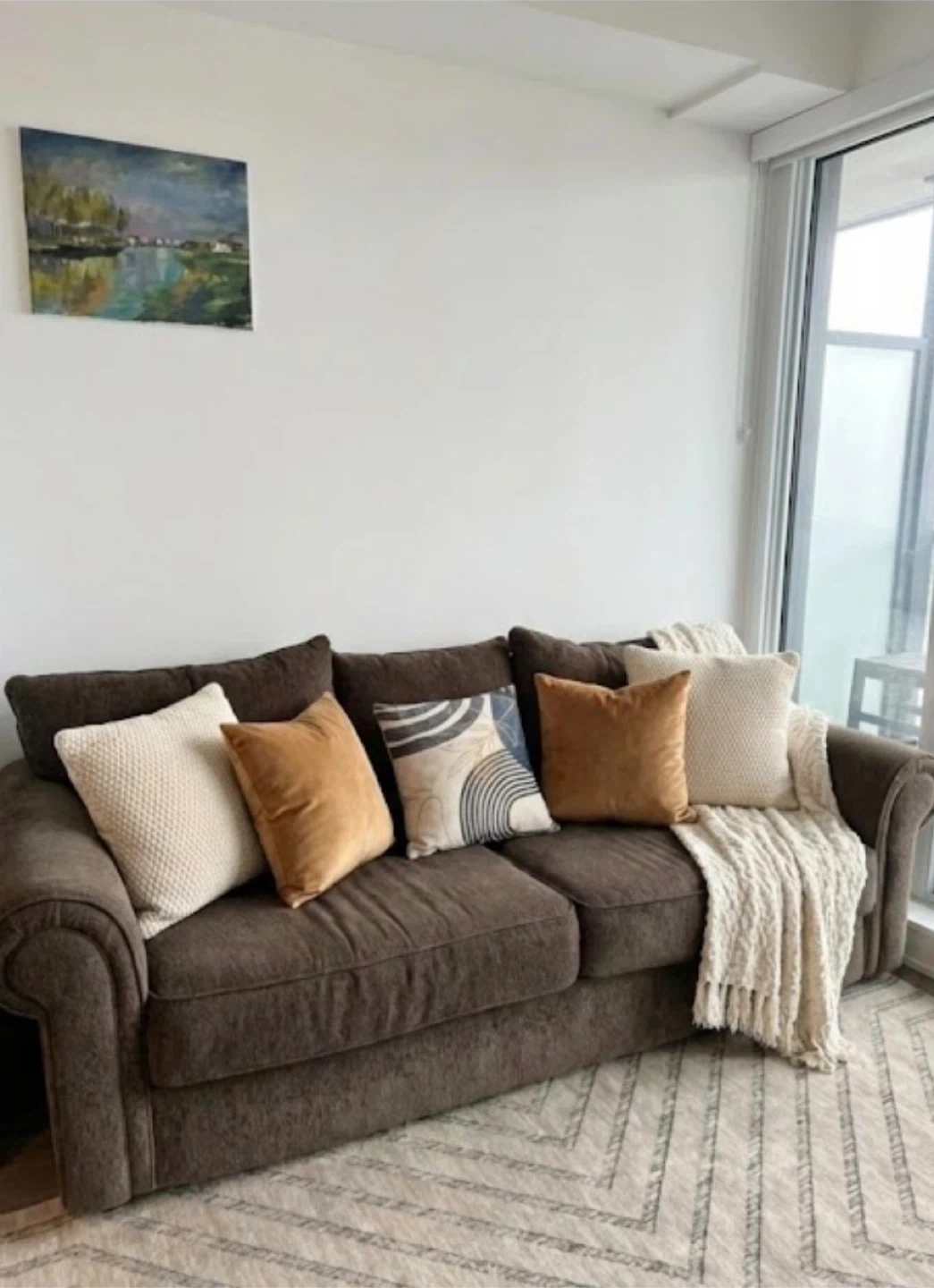 A comfortable brown sofa featuring plush fabric. It is 38 inches wide. This sofa is perfect for a living room setup.