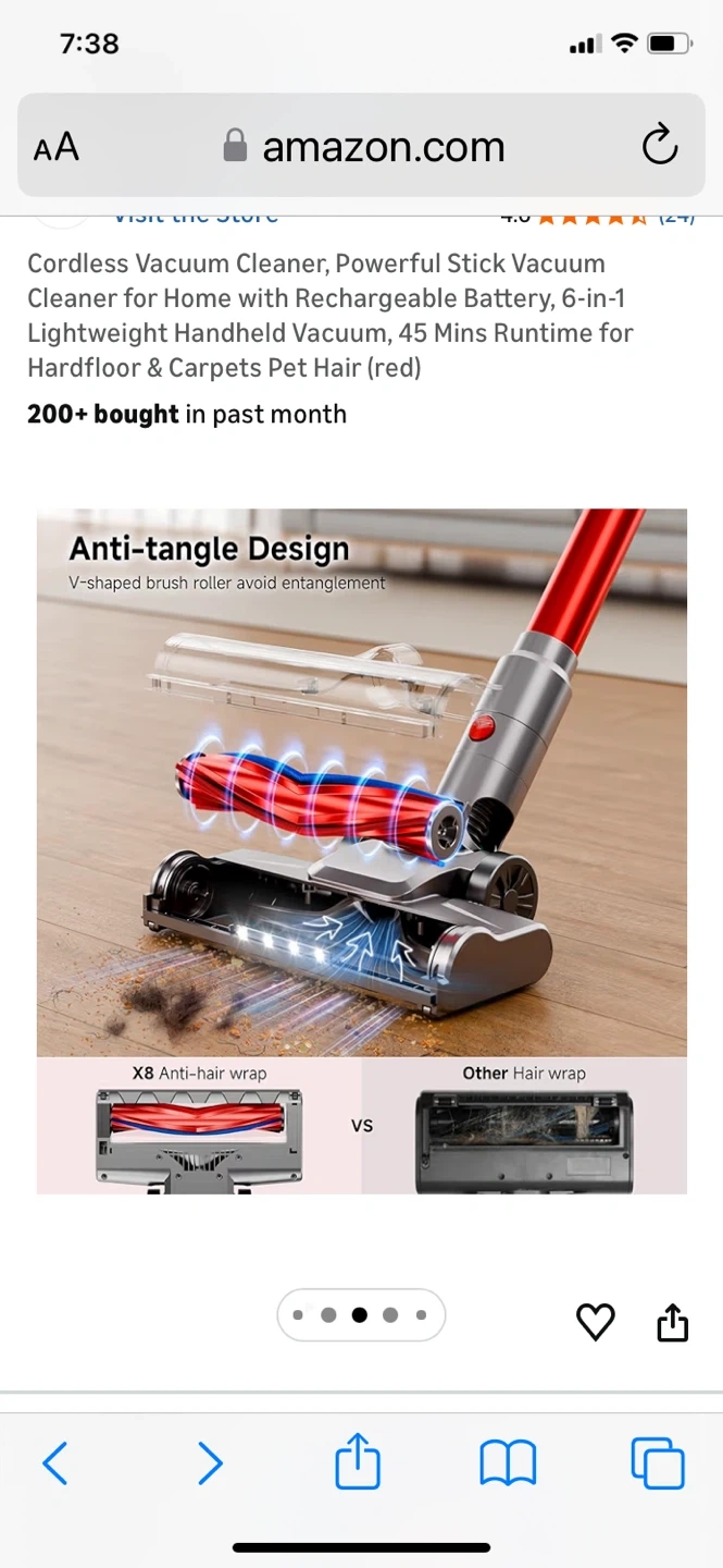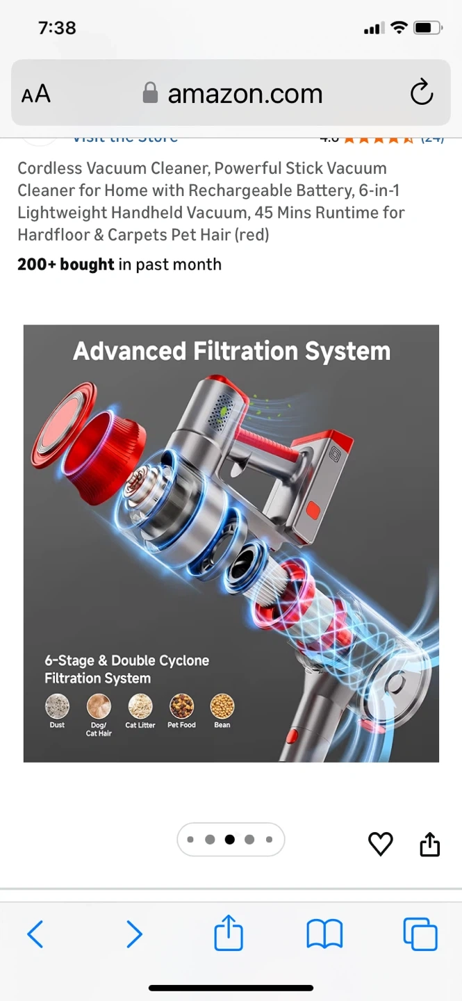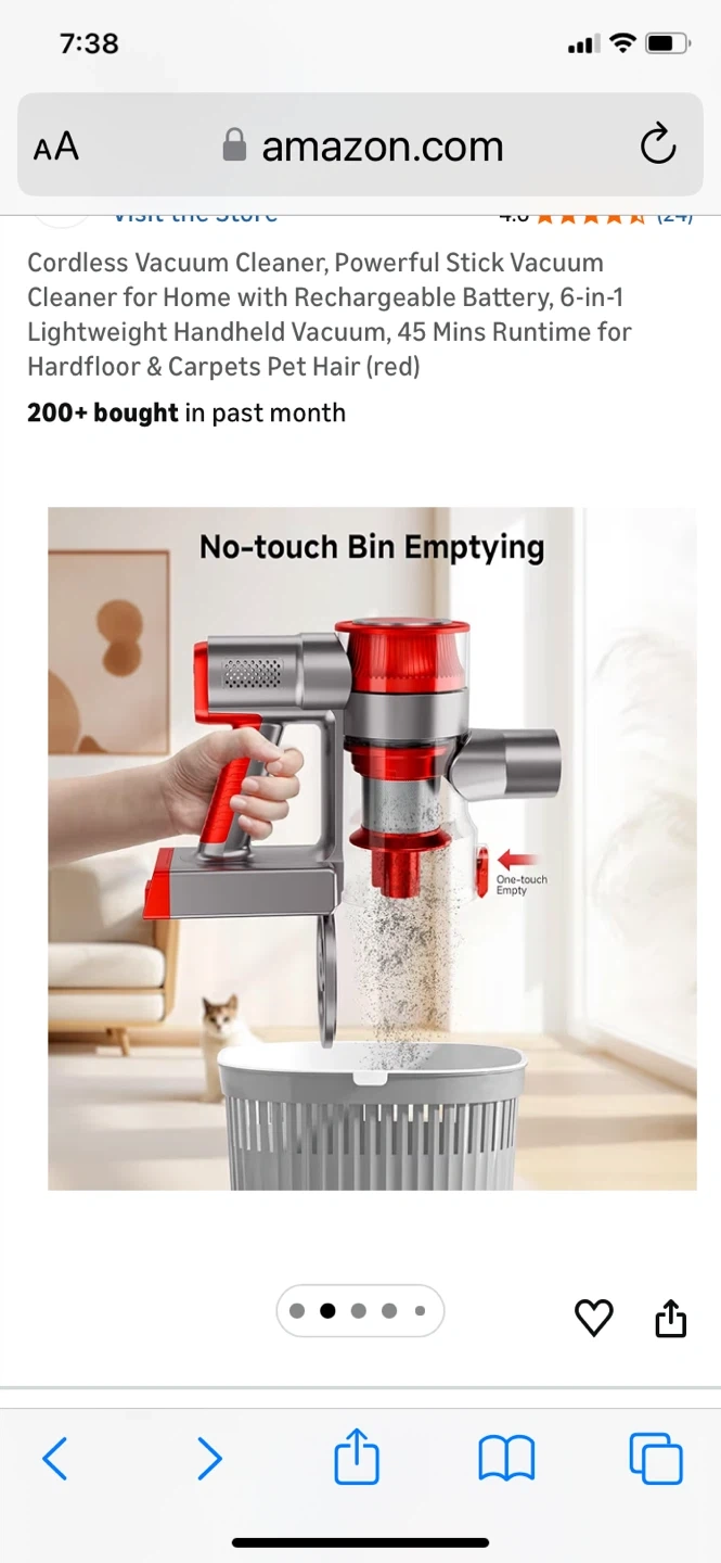This is a red cordless stick vacuum cleaner with a rechargeable battery. It offers 45 minutes of runtime and a 6-stage, double cyclone filtration system. It features no-touch bin emptying and a removable battery that can be charged separately.