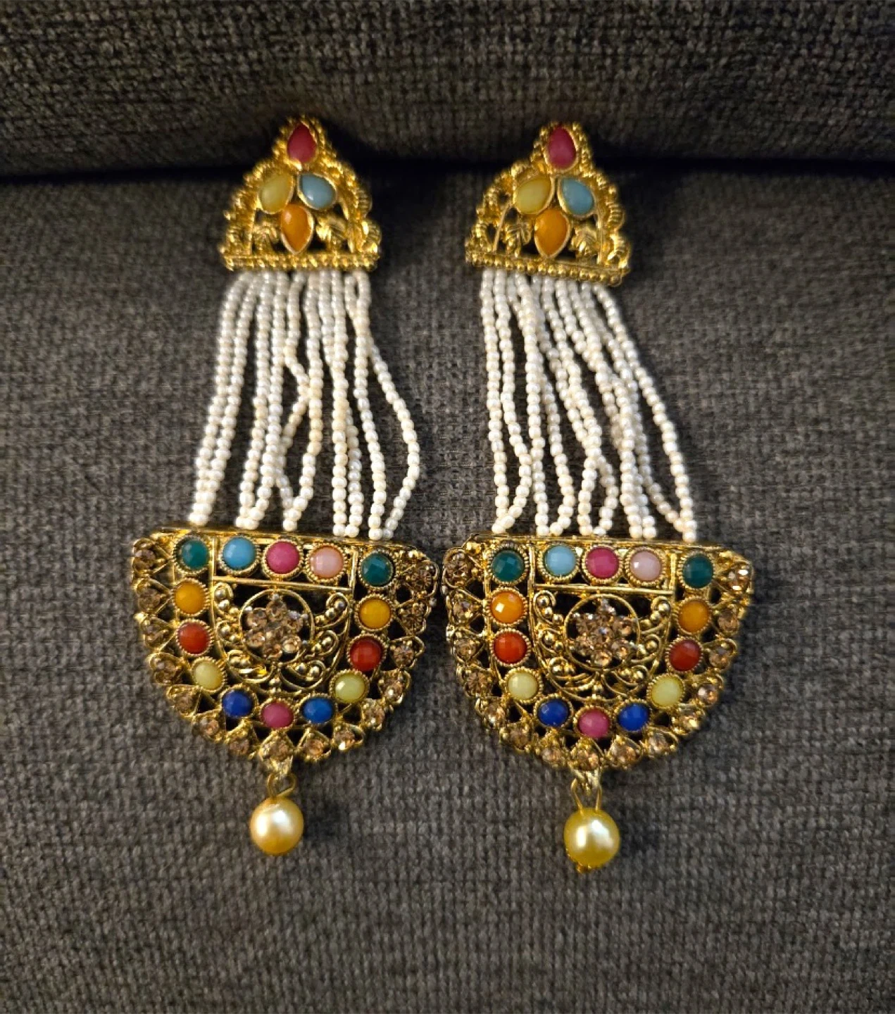 These are a pair of colourful earrings with pearl drops. They have a gold-tone base with colourful stones and pearl accents. Perfect for adding a pop of colour to any outfit