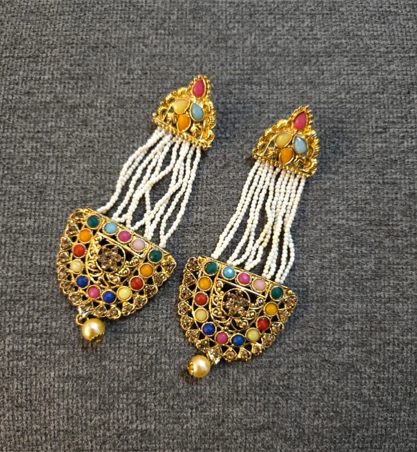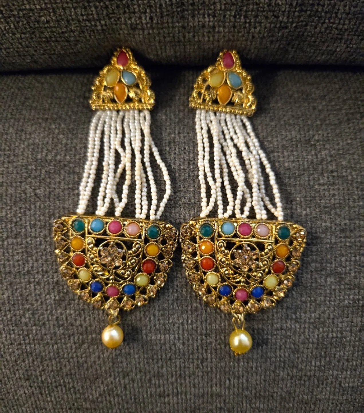These are a pair of colourful earrings with pearl drops. They have a gold-tone base with colourful stones and pearl accents. Perfect for adding a pop of colour to any outfit