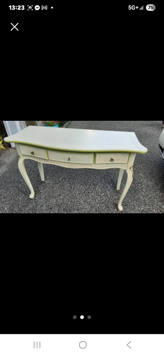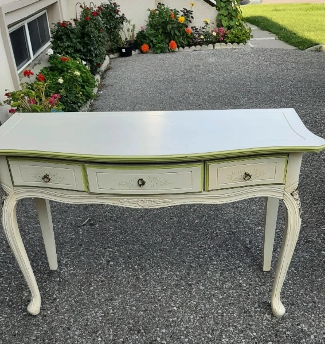 Selling a charming antique-style console table! It features a cream-coloured finish with a lovely green accent. It has three drawers, perfect for storing your essentials. It would make a great addition to your home