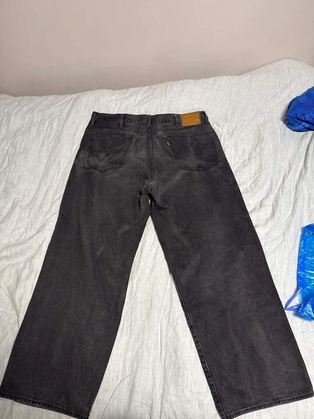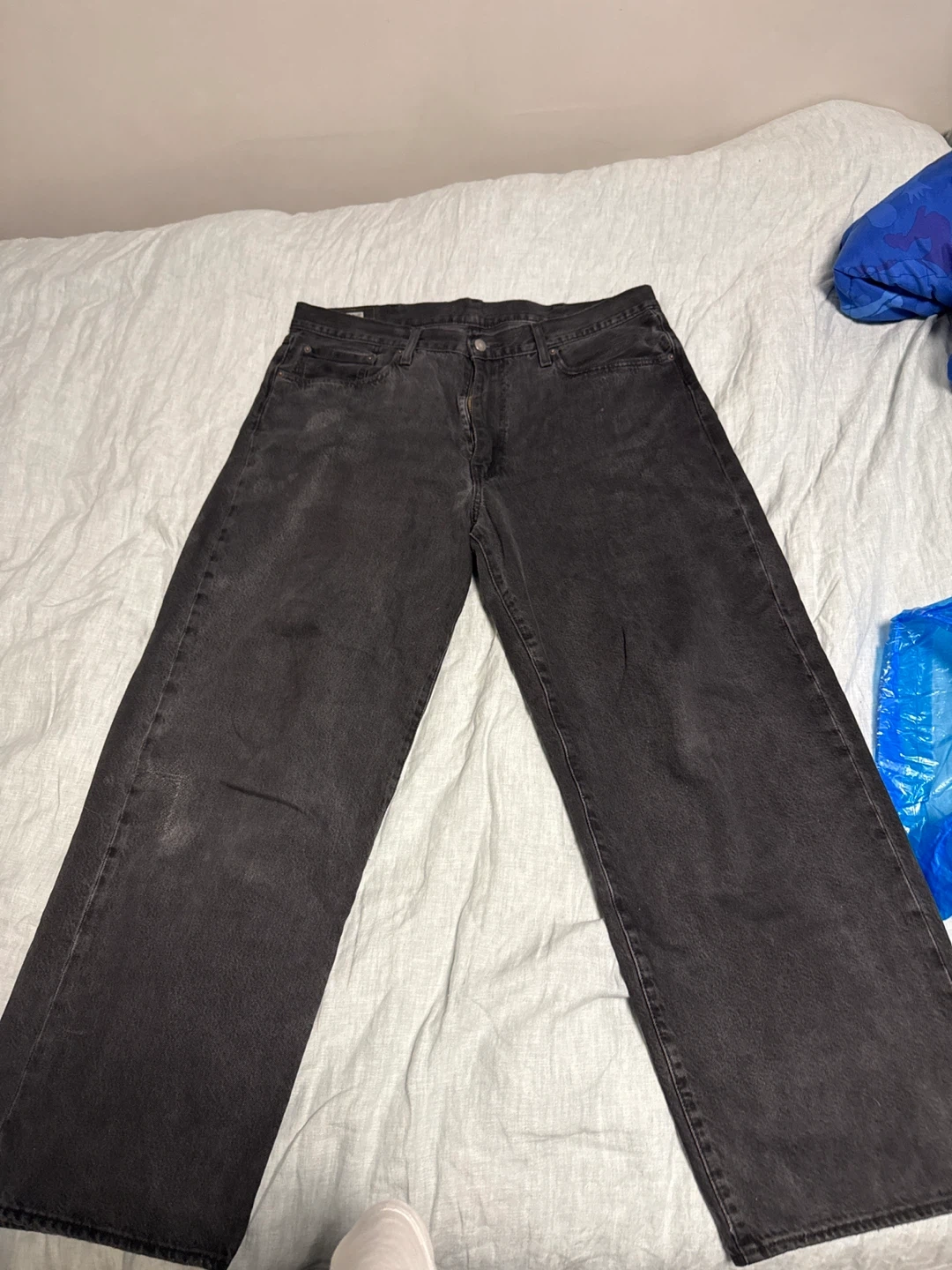 These Levi's 575 jeans come in a relaxed fit and black wash. Made with durable denim. A classic wardrobe staple! Has a minor hole on the right leg that has been patched.