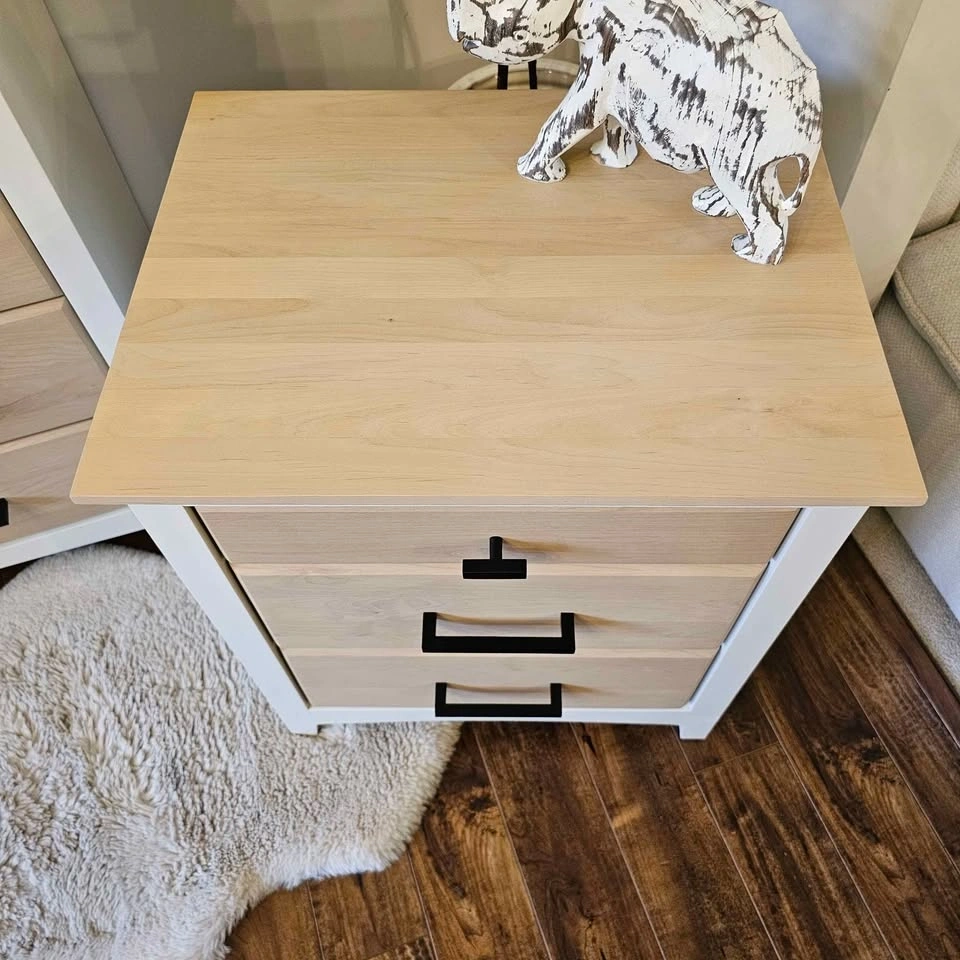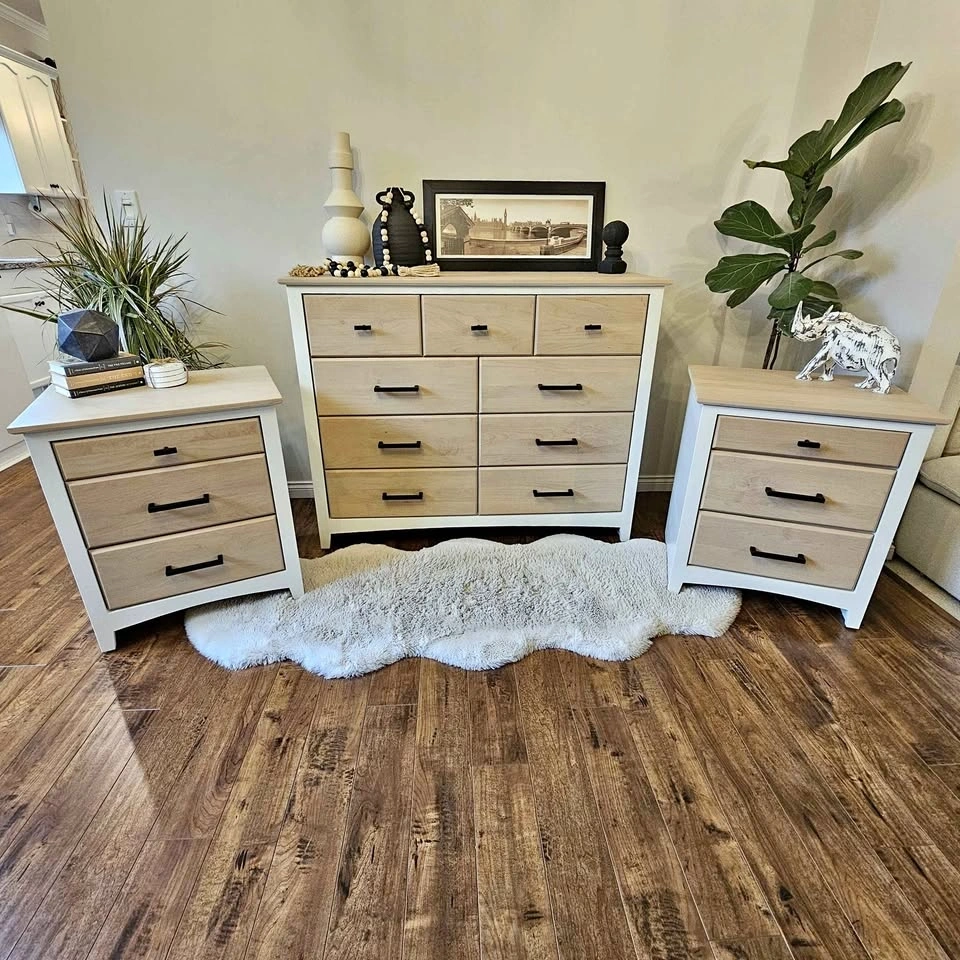 Refinished Solid Alder Wood Dresser and Bedside Tables made by Mako. Painted in Benjamin Moore's Seapearl (very light off-white) with a factory-smooth, durable spray finish. A small container of touch-up paint is included.