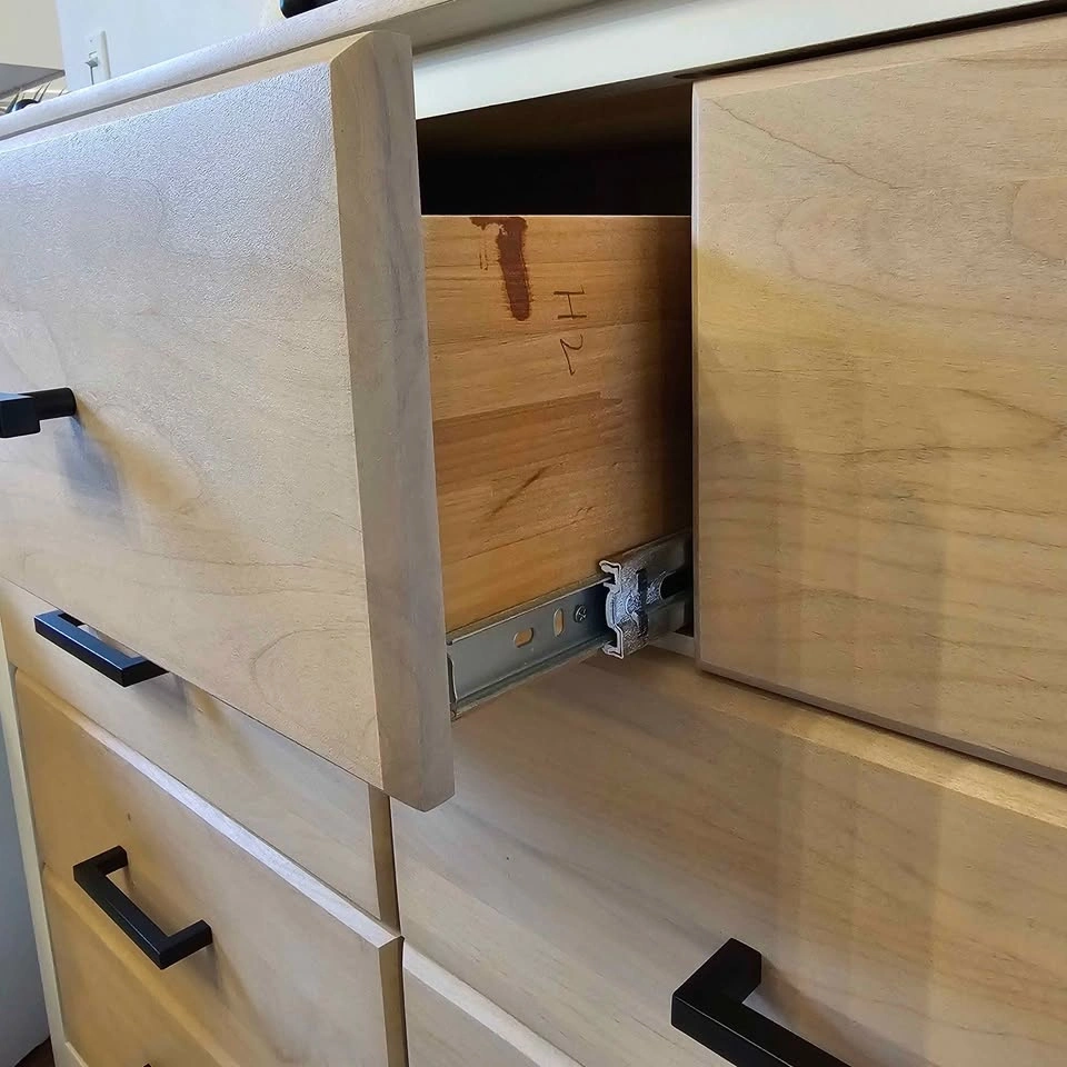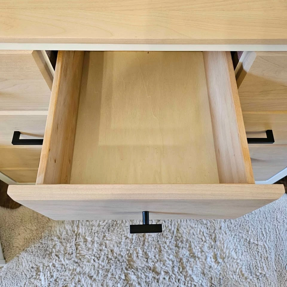 The rest has been sanded and stained a custom light brown/tan, sealed with Diamond Finish Varathane in a matte finish. Drawers are on smooth glides with dovetail joints. Brand new black hardware has been added.
