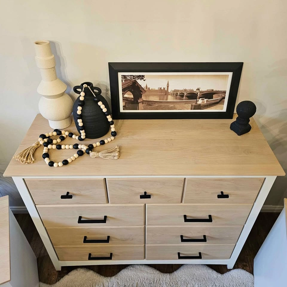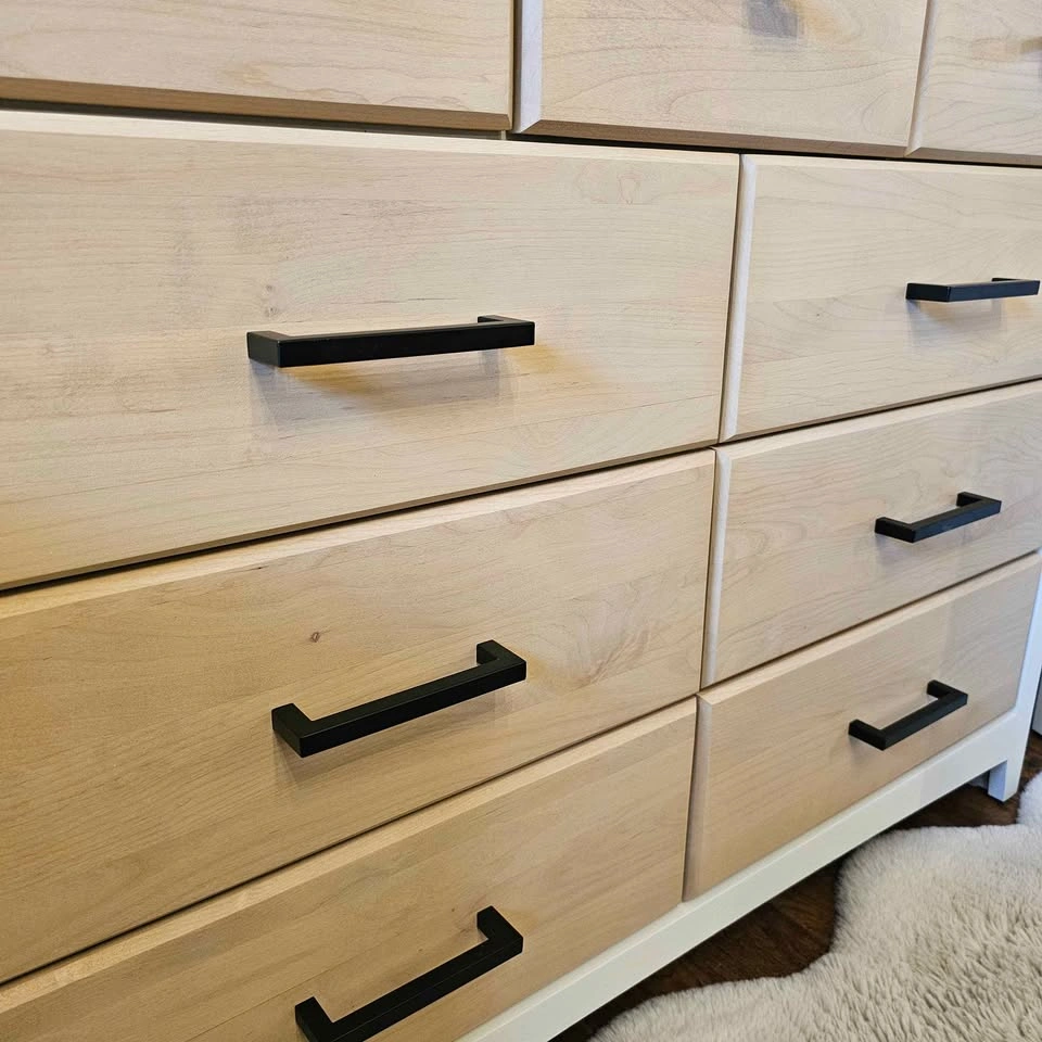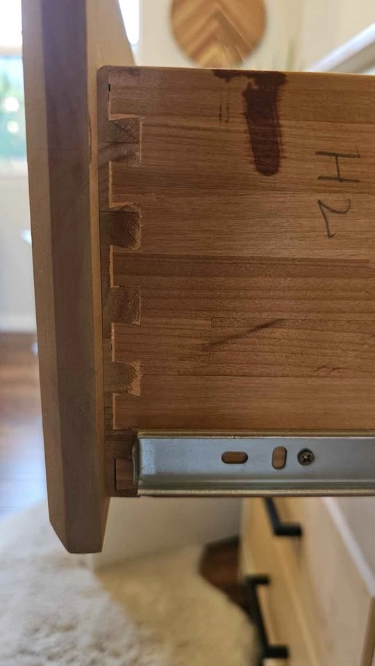 The rest has been sanded and stained a custom light brown/tan, sealed with Diamond Finish Varathane in a matte finish. Drawers are on smooth glides with dovetail joints. Brand new black hardware has been added.