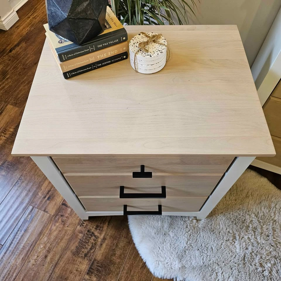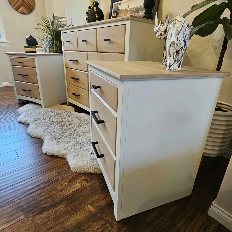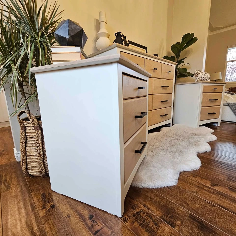 Refinished Solid Alder Wood Dresser and Bedside Tables made by Mako. Painted in Benjamin Moore's Seapearl (very light off-white) with a factory-smooth, durable spray finish. A small container of touch-up paint is included.