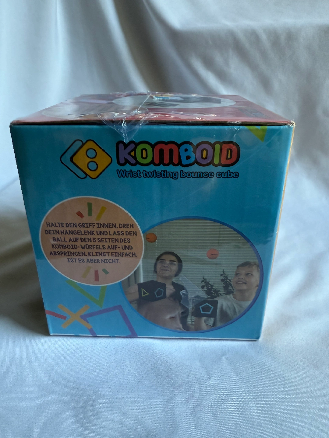 Get ready to twist and bounce with this KOMBOID Wrist Twisting Bounce Cube! It's brand new in the box, ready for some fun. Grab the handle, twist your wrist, and bounce the ball on the 5 sides of the KOMBOID cube; sounds easy, but it's not! Includes party game cards and combo challenges