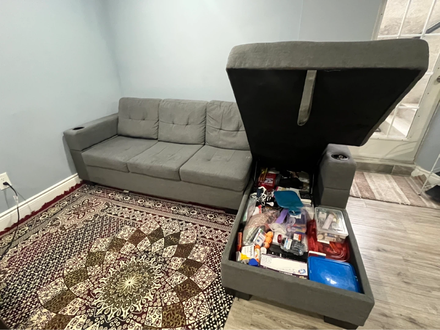 Comfortable grey sectional sofa with ample storage. It features a chaise lounge with hidden storage underneath, perfect for stowing away blankets or toys! This couch also includes built-in cup holders on the armrests.