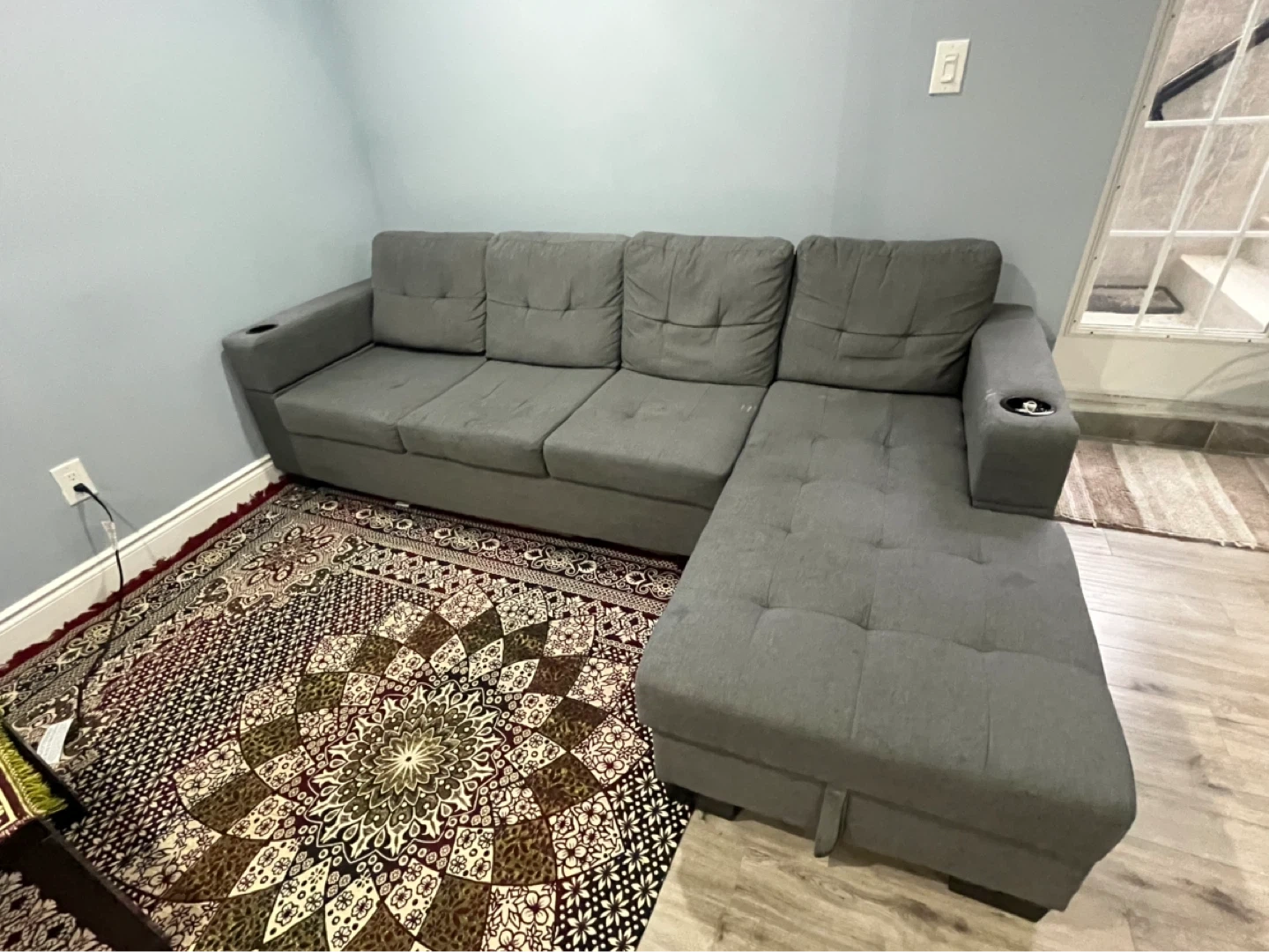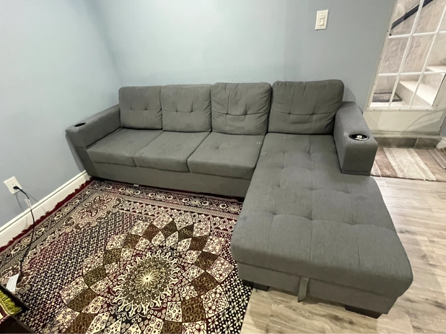 Comfortable grey sectional sofa with ample storage. It features a chaise lounge with hidden storage underneath, perfect for stowing away blankets or toys! This couch also includes built-in cup holders on the armrests.