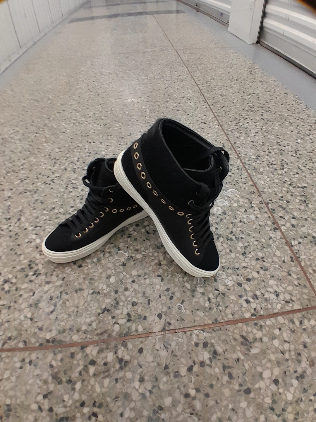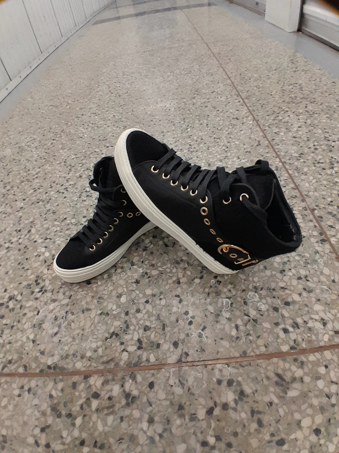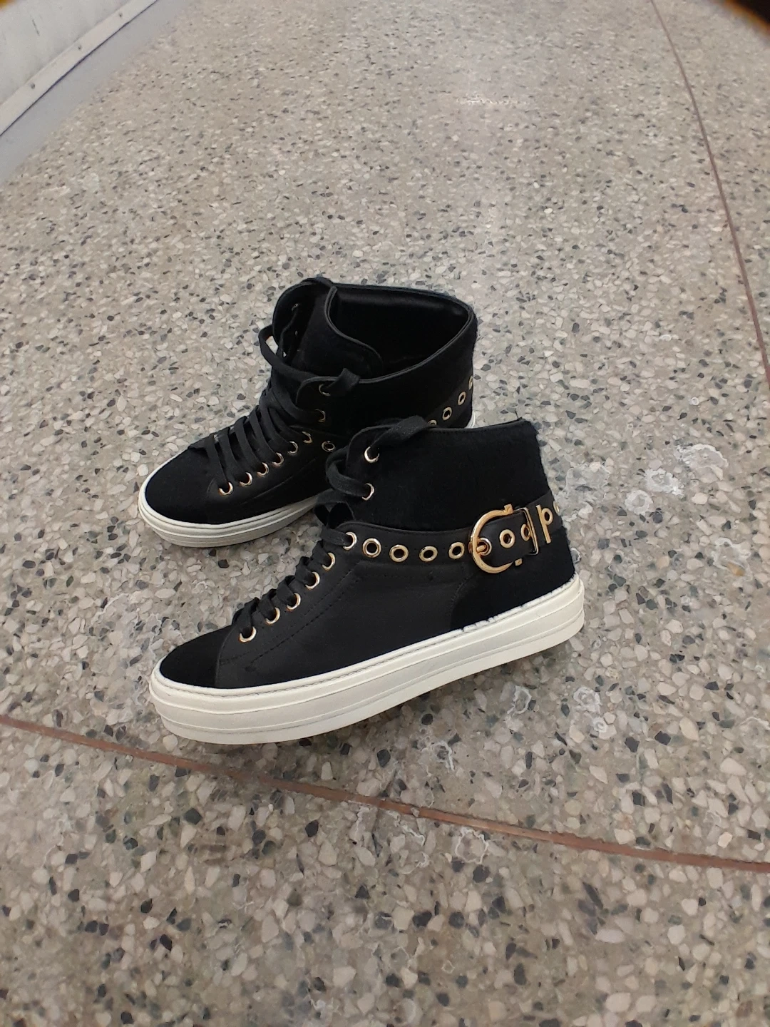 Black high-top sneakers featuring gold eyelets and buckle details original Ferragamo Salvatore women's size 7