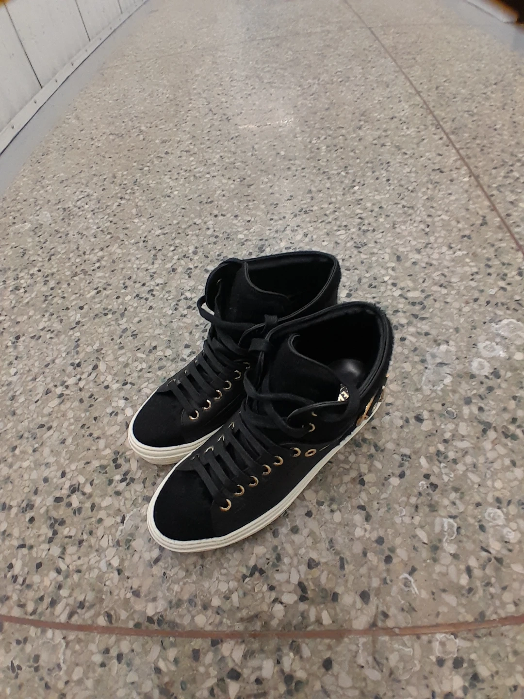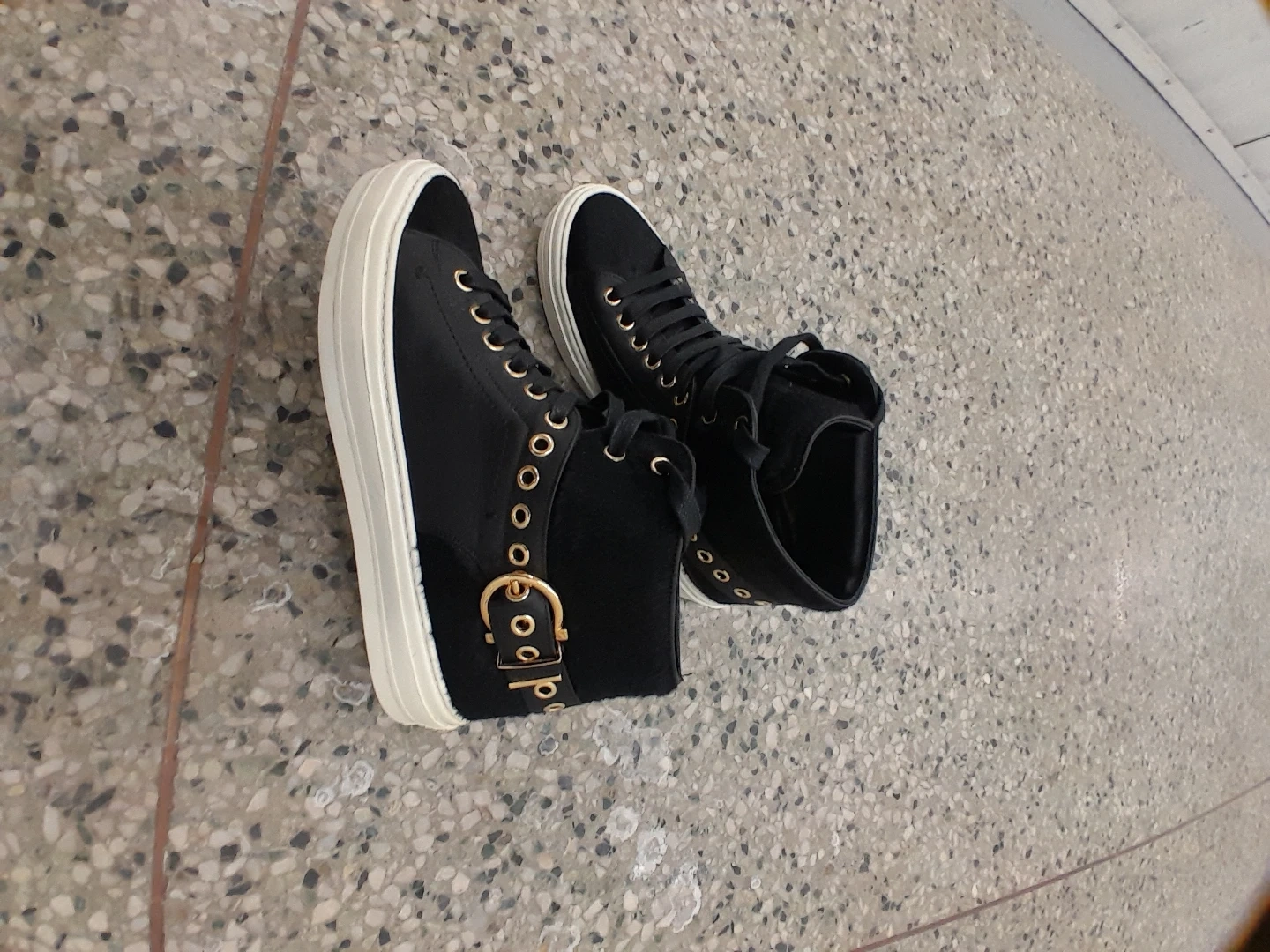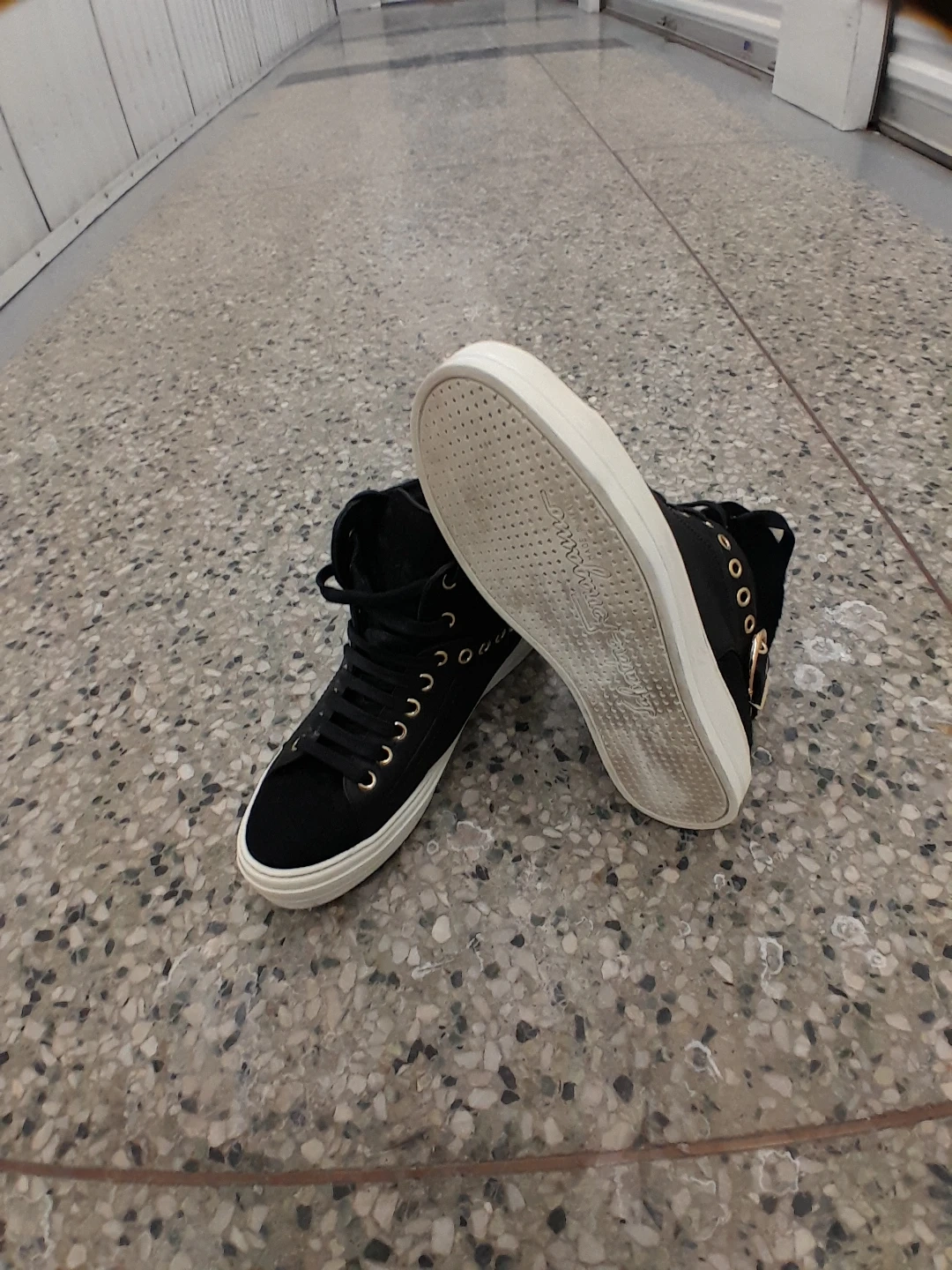 Black high-top sneakers featuring gold eyelets and buckle details original Ferragamo Salvatore women's size 7