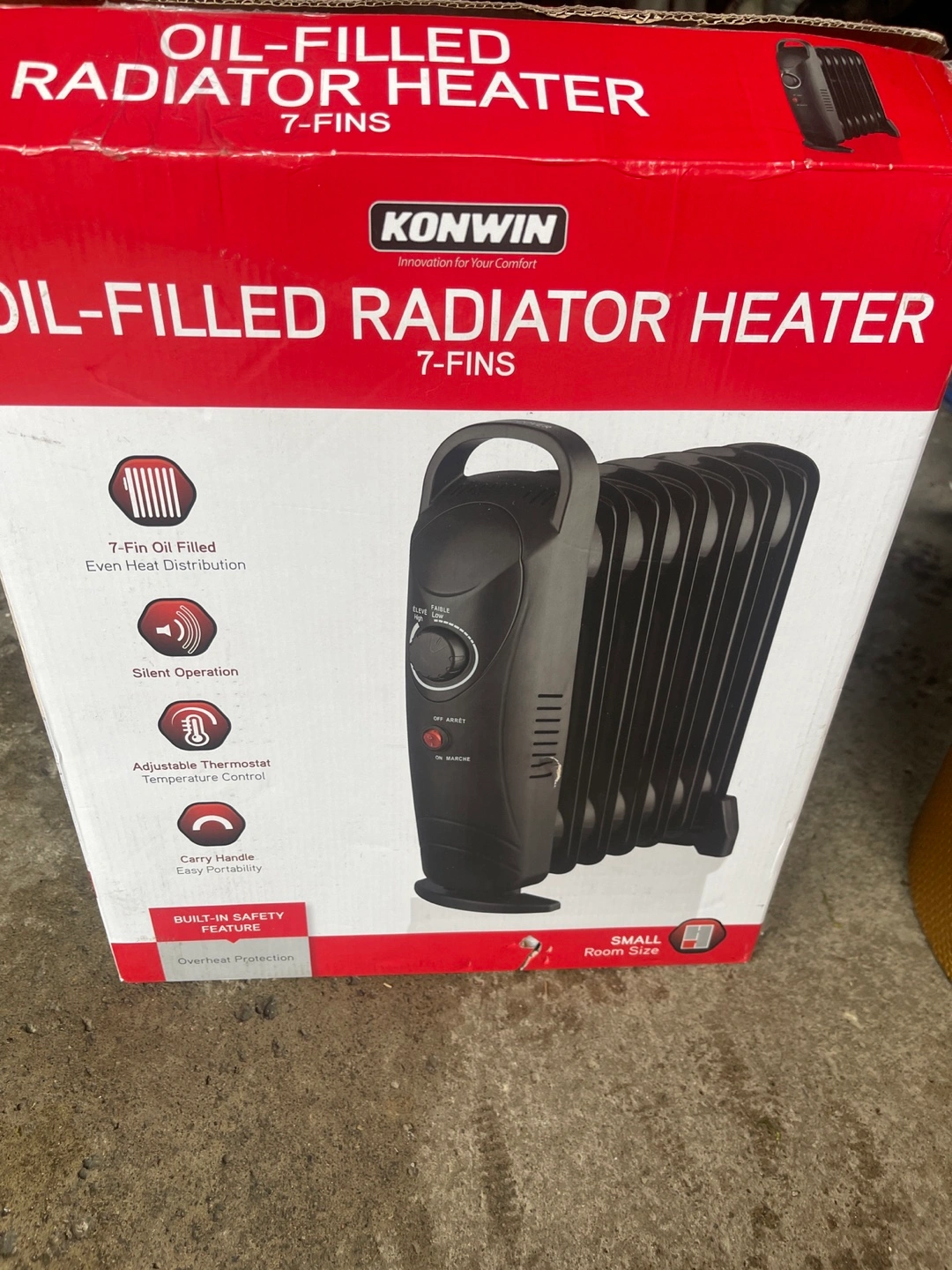 Small room size. Seven-fin oil-filled design. Even heat distribution. Silent operation. Adjustable thermostat for temperature control. Carry handle for easy portability. Built-in overheat protection.