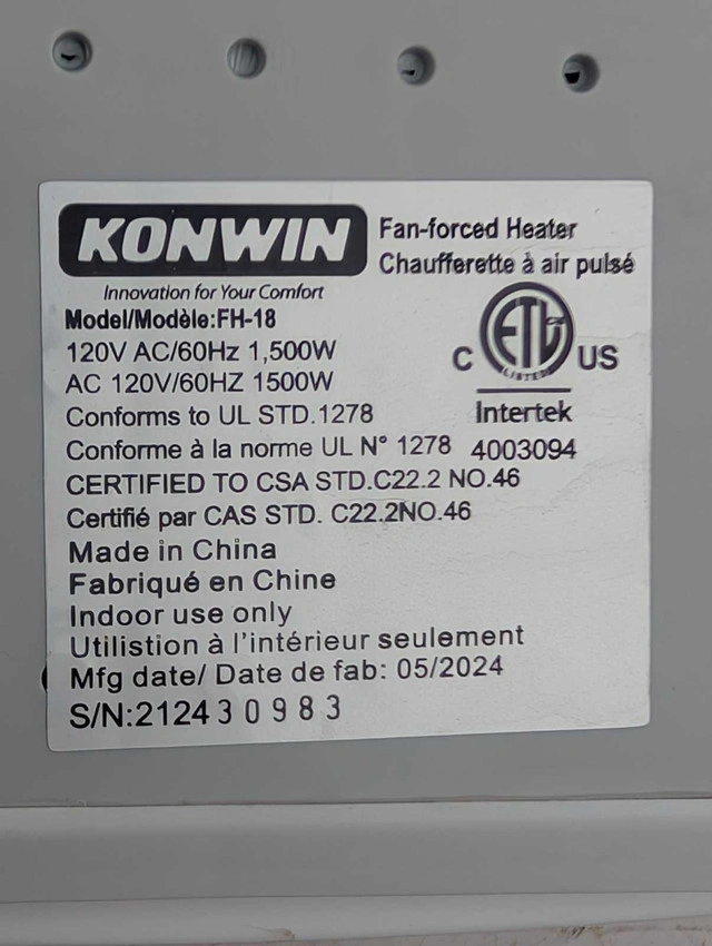 5Keep your space cozy with this Konwin fan-forced heater, model FH-18, operating at 120V and 1500W, perfect for those chilly Canadian evenings. Key Features: * Brand: Konwin * Model: FH-18 * Power: 120V, 1500W Looking to add a touch of warmth to your room without breaking the bank? This heater is ready to go! And just so you know, if the ad is up, it's still available for grabs! Call, text Nick and offer 705-440-9159