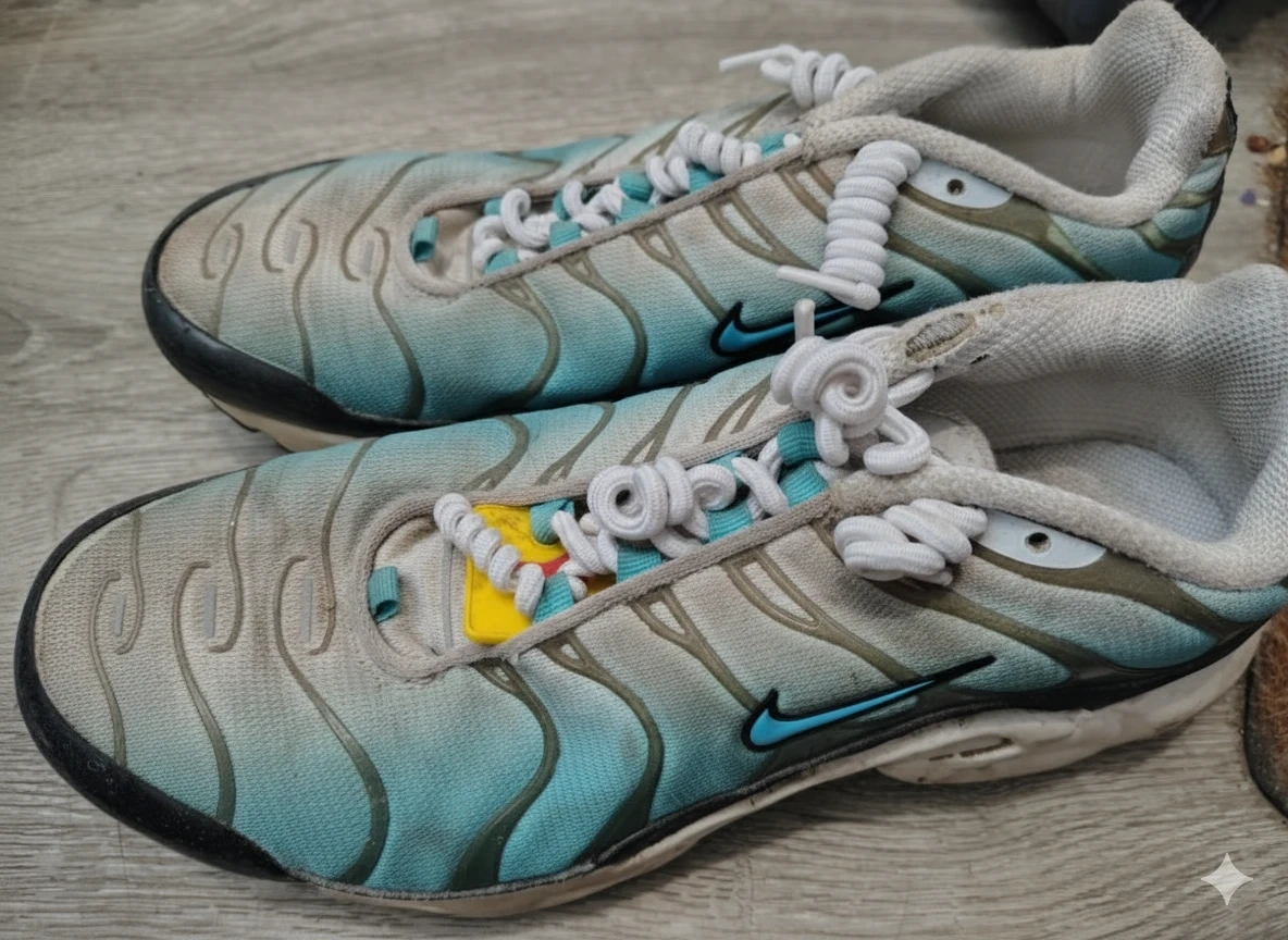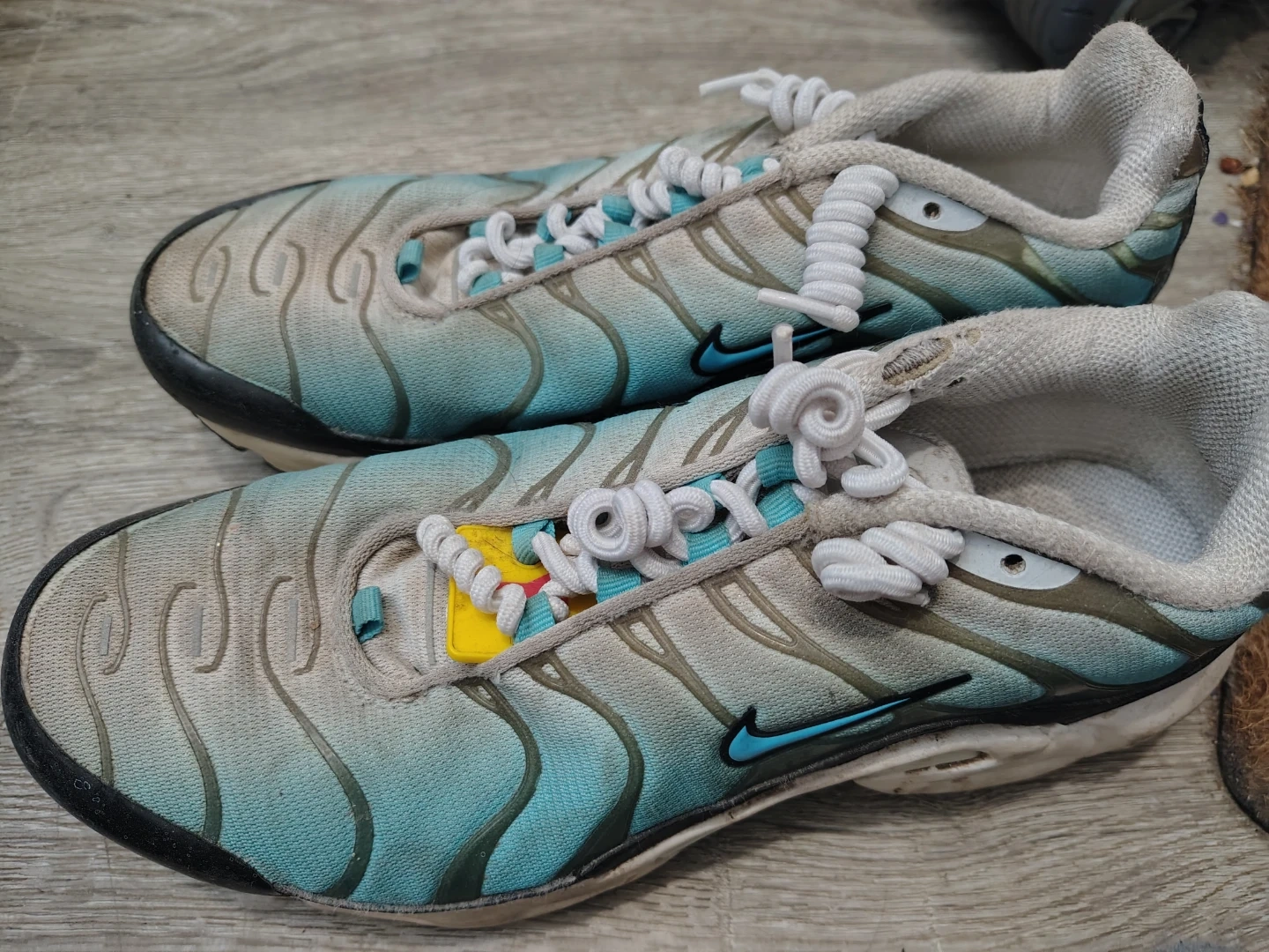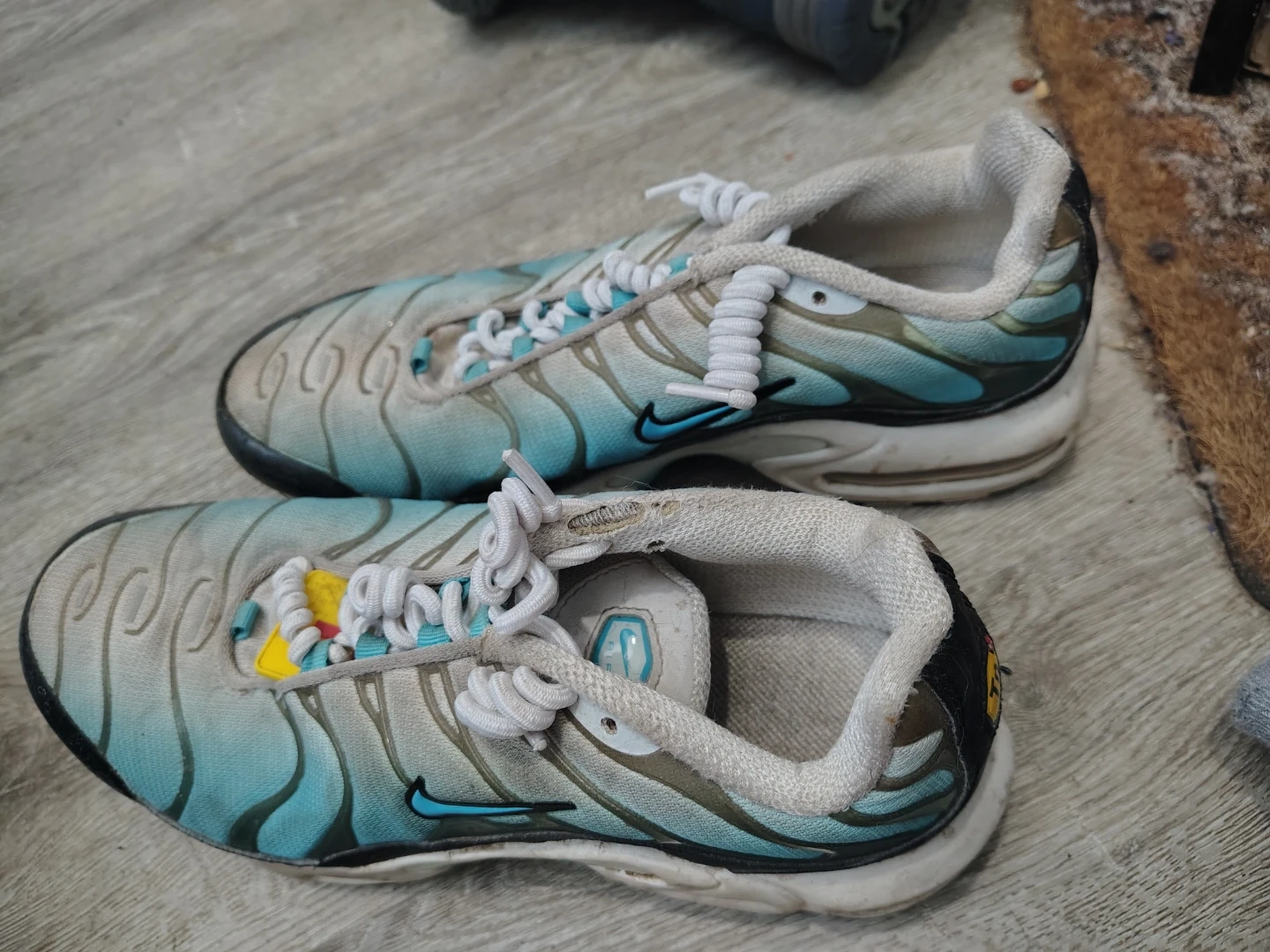 These Nike Air Max Plus TN SE shoes come in a unique blue and grey colourway. They feature the iconic Nike Swoosh and a cushioned sole for comfort. Great for everyday wear!