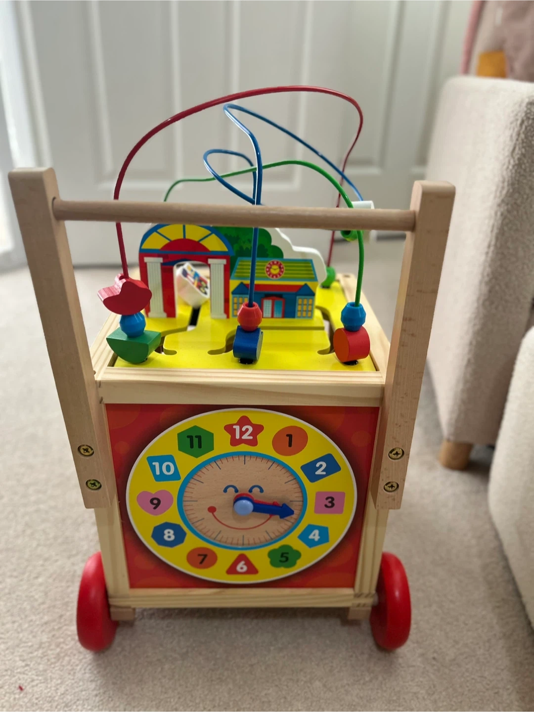 This wooden activity walker features a bead maze, shape sorter, abacus, and a clock. It's designed to engage little ones with various tactile and visual learning elements. Great for developing fine motor skills and early learning concepts!