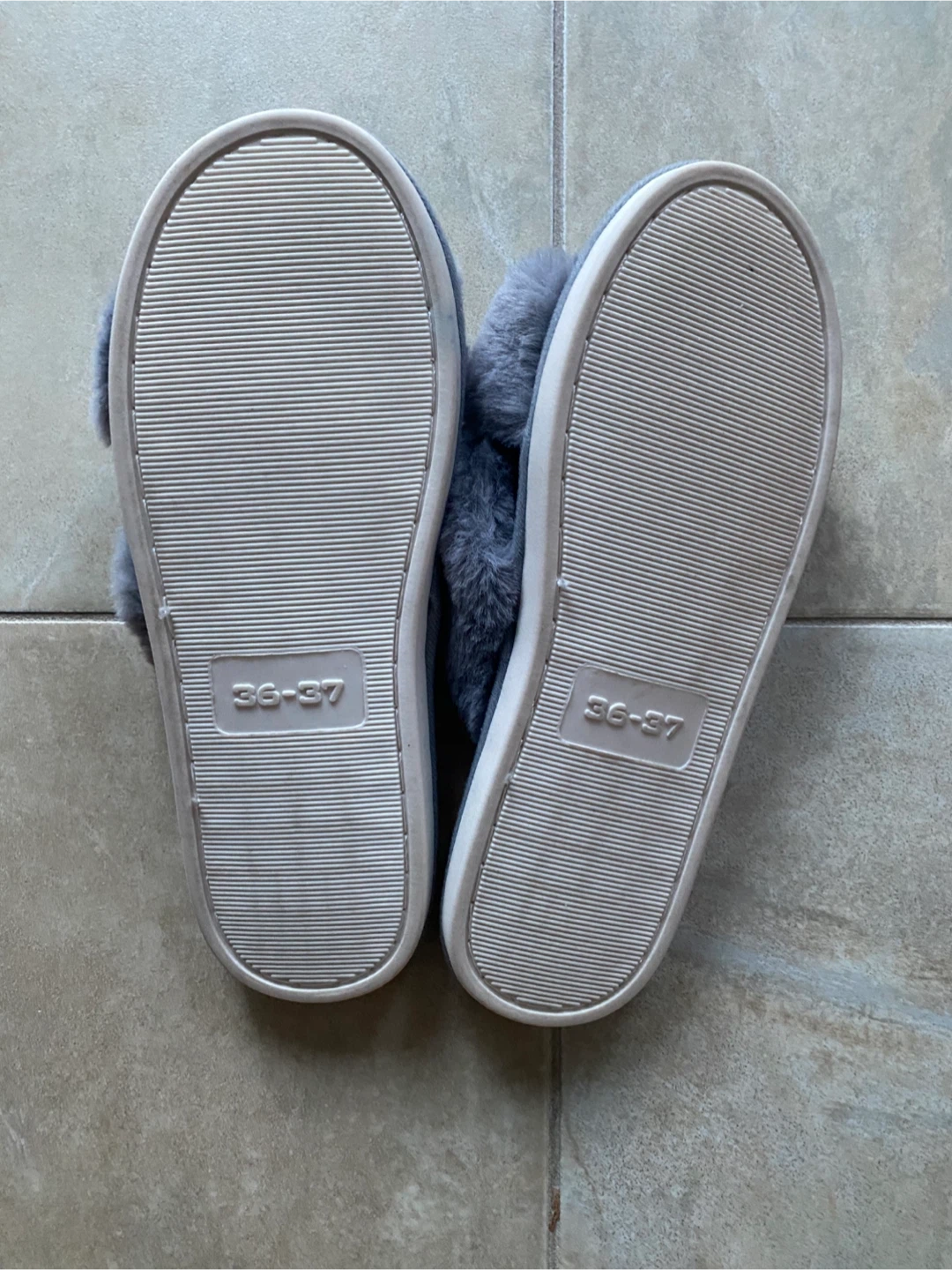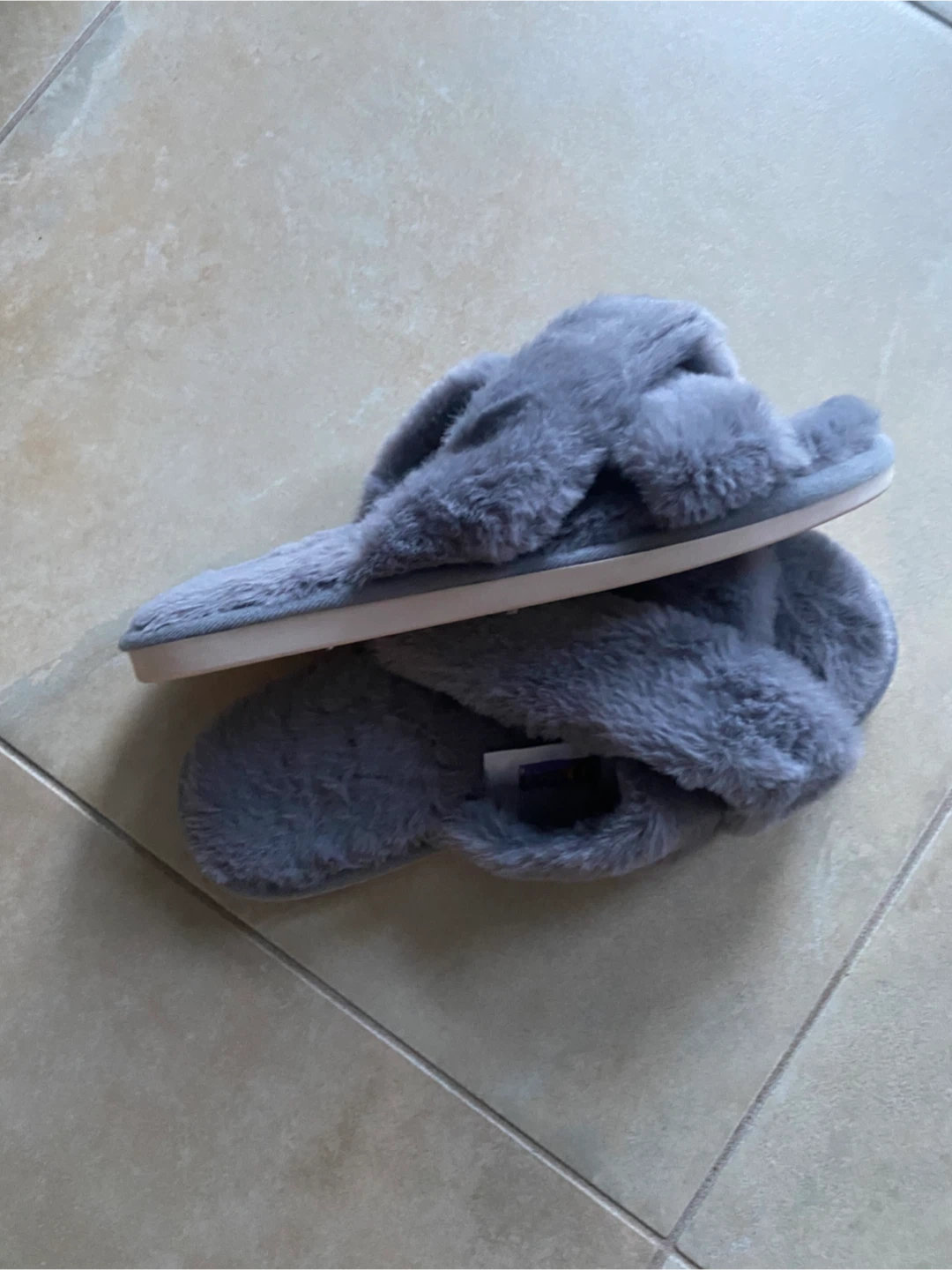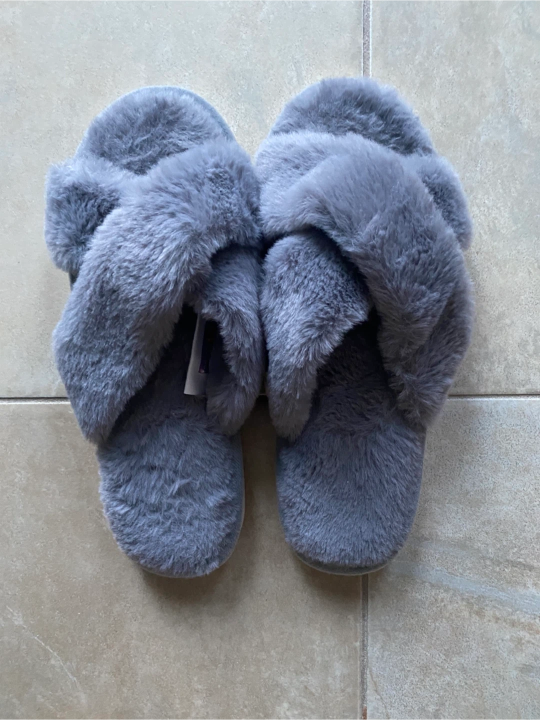 These are brand new Comfy grey fuzzy slippers with criss-cross straps. These are a size 36-37.