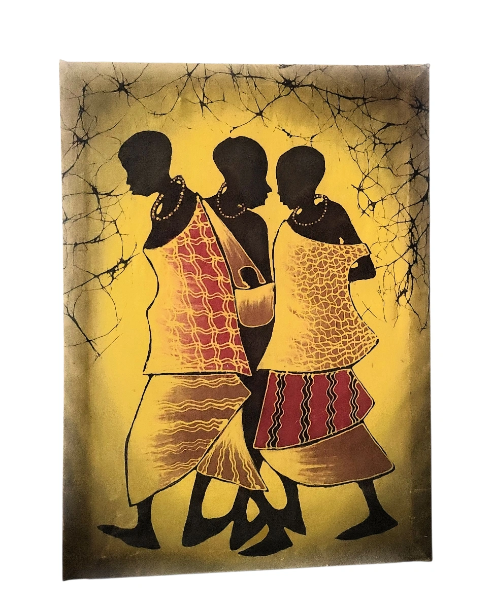 This is a beautiful piece of African art, depicting three figures in traditional clothing. It's a unique and eye-catching painting that would add a touch of culture to any room!