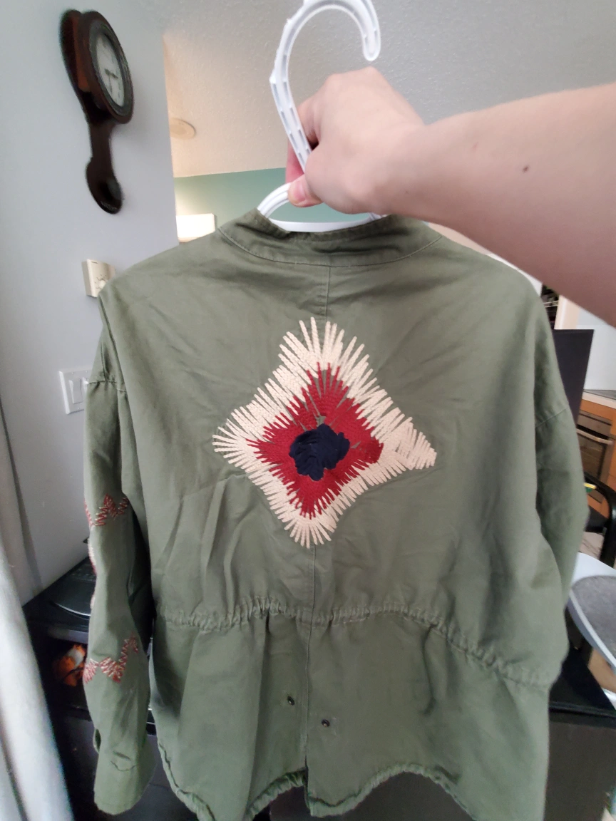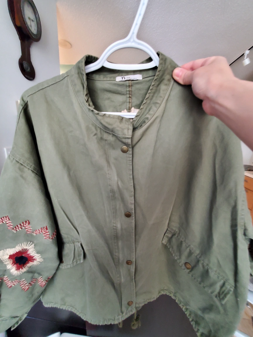 360Selling a cute Niche olive green jacket with embroidered details! It's in great condition and features a unique design on the sleeves and back. Perfect for adding a touch of style to any outfit.