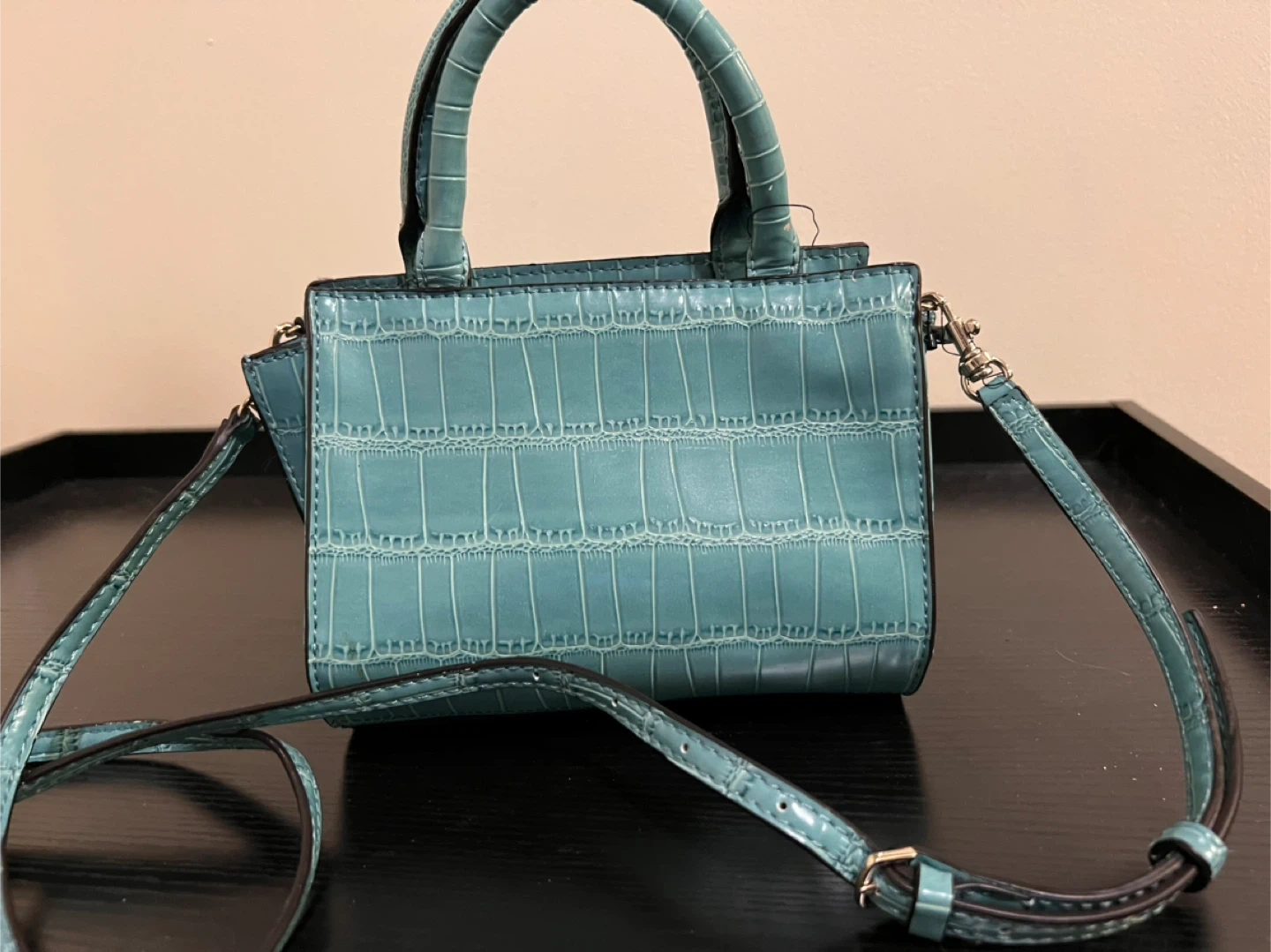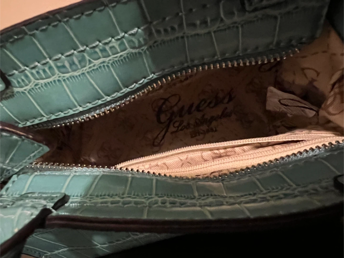 Check out this cute Guess mini satchel! It features a teal crocodile embossed design with a snakeskin pattern on the flap. Perfect for adding a pop of colour to your outfit! Brand new, paid $85.