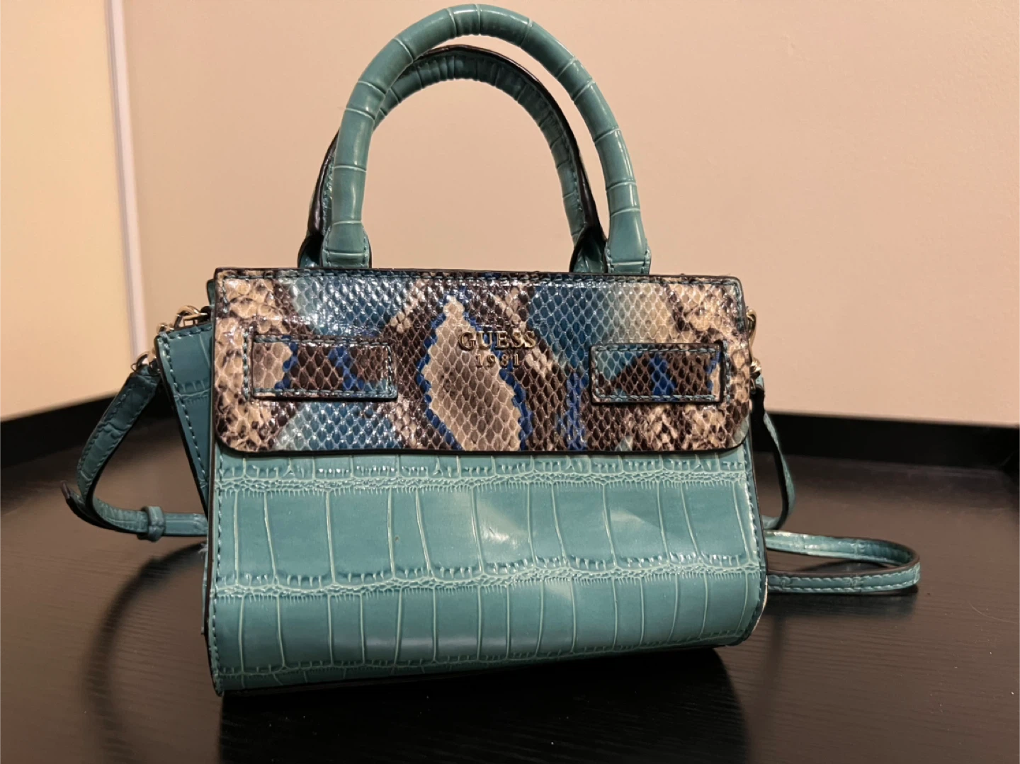Check out this cute Guess mini satchel! It features a teal crocodile embossed design with a snakeskin pattern on the flap. Perfect for adding a pop of colour to your outfit! Brand new, paid $85.
