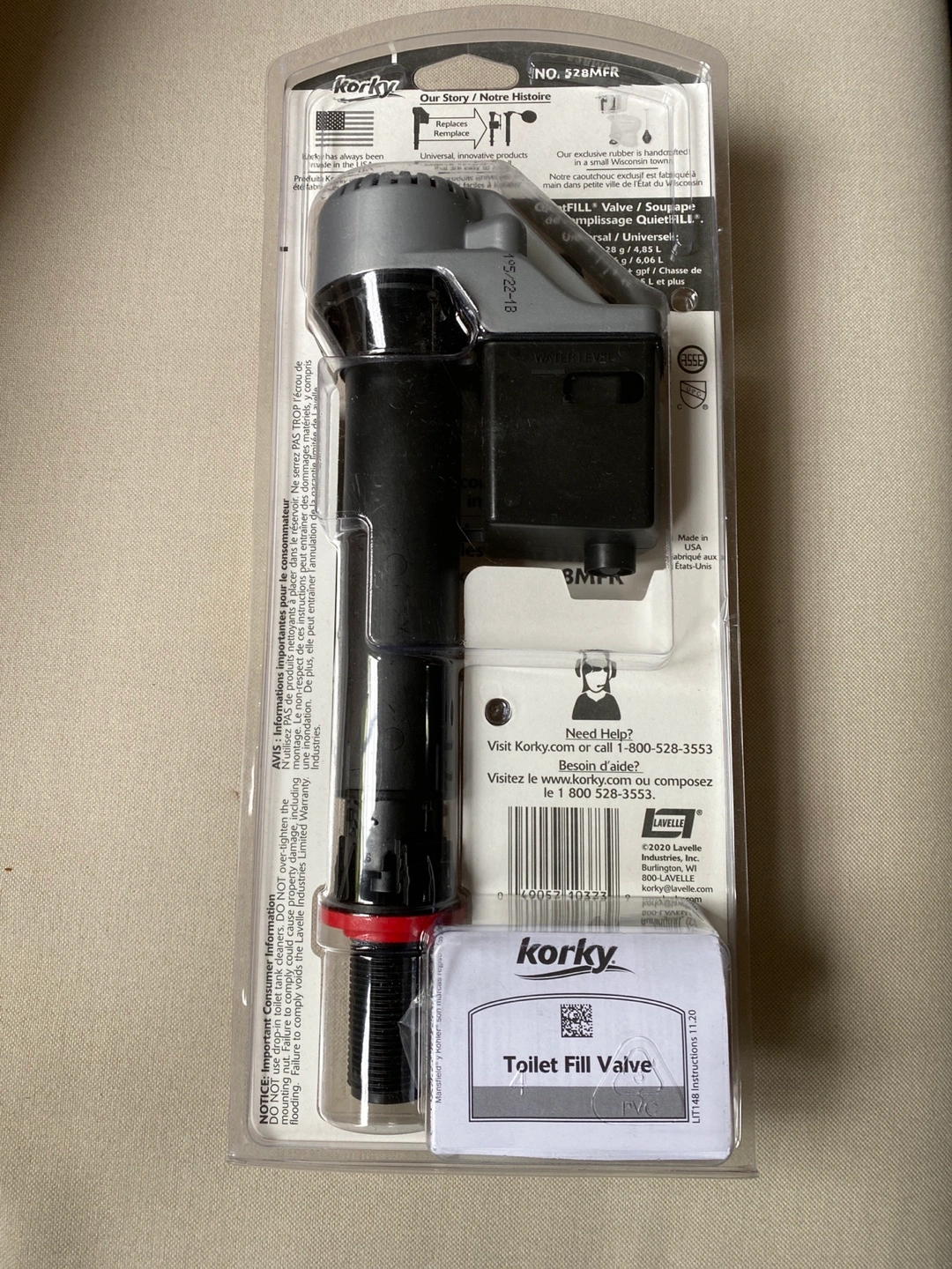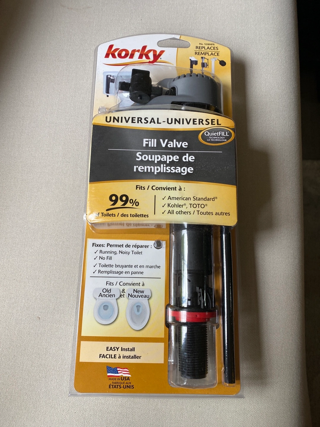 10New, unopened Korky universal toilet fill valve. Fits 99% of toilets. Easy install. Replaces running, noisy, or broken fill valves. Compatible with American Standard, Kohler, Toto and others.