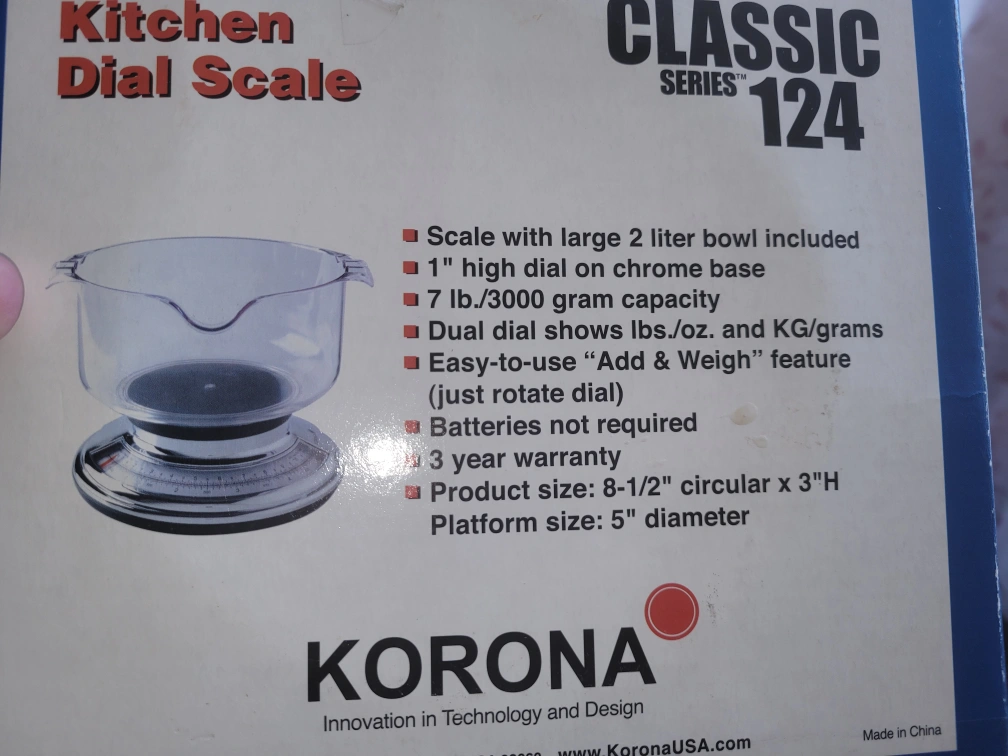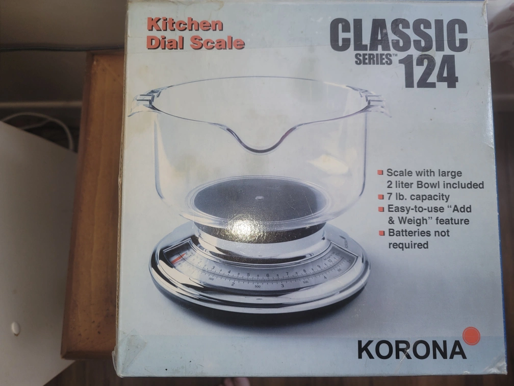 34I'm selling a Korona Classic Series 124 kitchen dial scale. It includes a large 2-liter bowl and has a 7 lb capacity. It also features an easy-to-use "Add & Weigh" function. The product size is 8-1/2" circular x 3"H and the platform size is 5" diameter. Batteries are not required