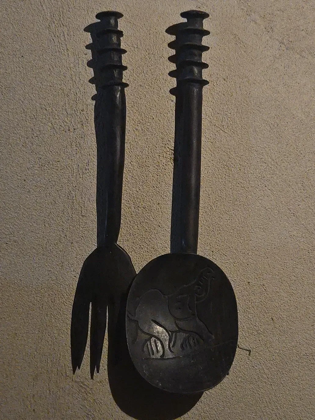 A set of two wooden salad servers from South Africa. One server is a fork and the other is a spoon. The spoon features a carved elephant design. These are handmade items.