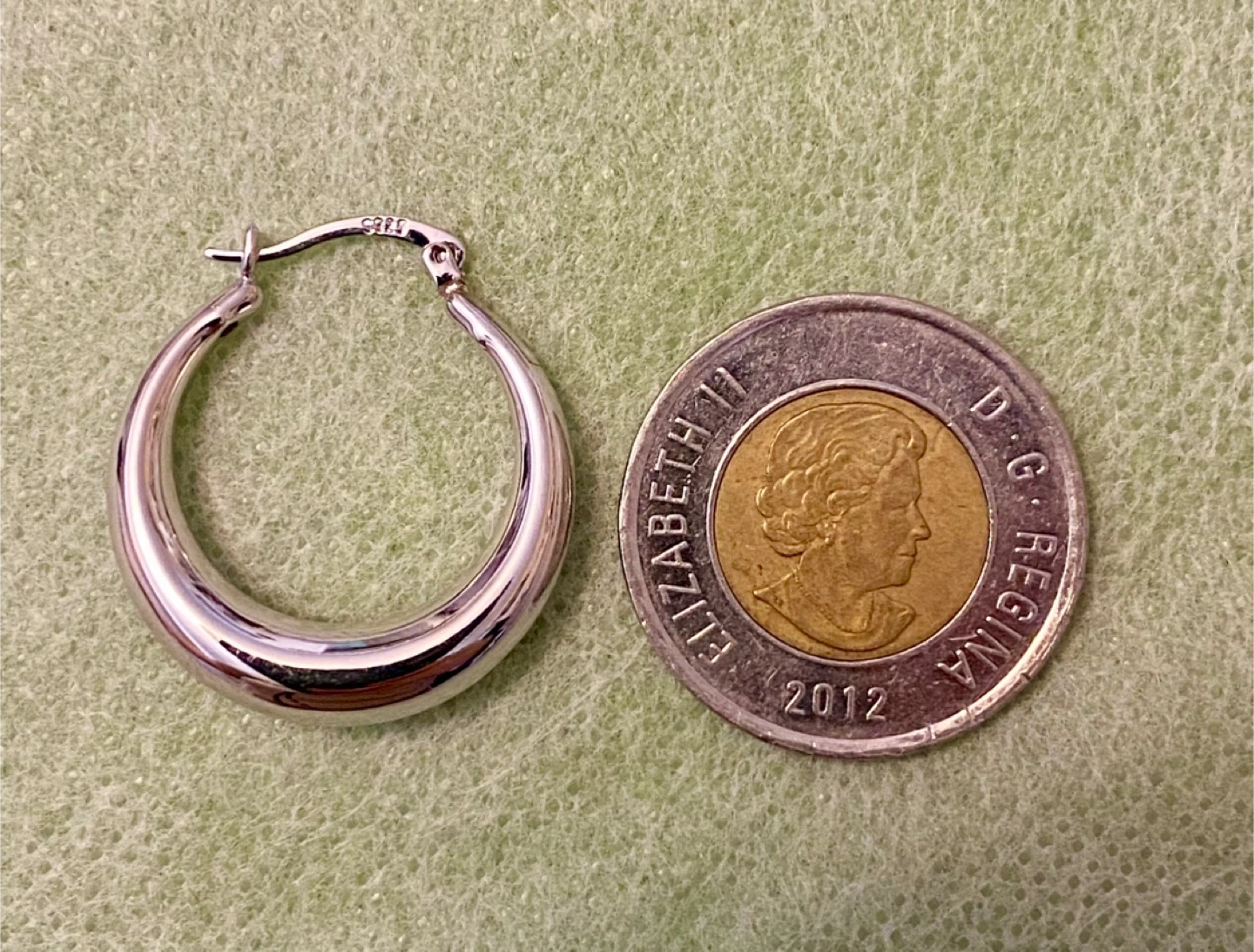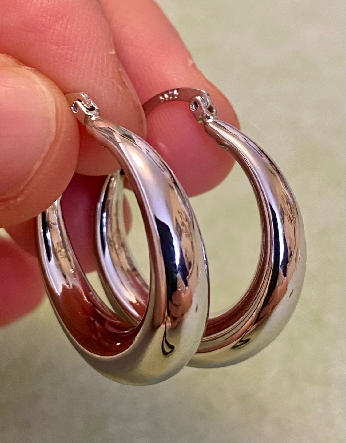 These are a pair of polished sterling silver 925 hoop earrings. They're substantial but not too heavy. These hoops would be a great everyday accessory!