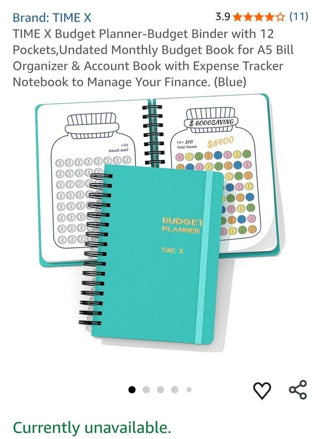 Get your finances in order with this new TIME X Budget Planner-Budget Binder. It comes complete with 12 pockets and an undated monthly budget book. Designed as an A5 bill organizer and account book with an expense tracker notebook, it's a perfect tool to manage your finances effectively. The planner comes in a stylish blue color. Features include: Twin-wire binding, Waterproof cover, Elastic band, Debt Tracker, Savings Tracker, Financial Strategy section, Financial Goals section, Undated monthly budget pages, and Christmas budget pages. I have 4 of them, each for $5. If the ad's still up, the planner is ready to find its forever home with you!