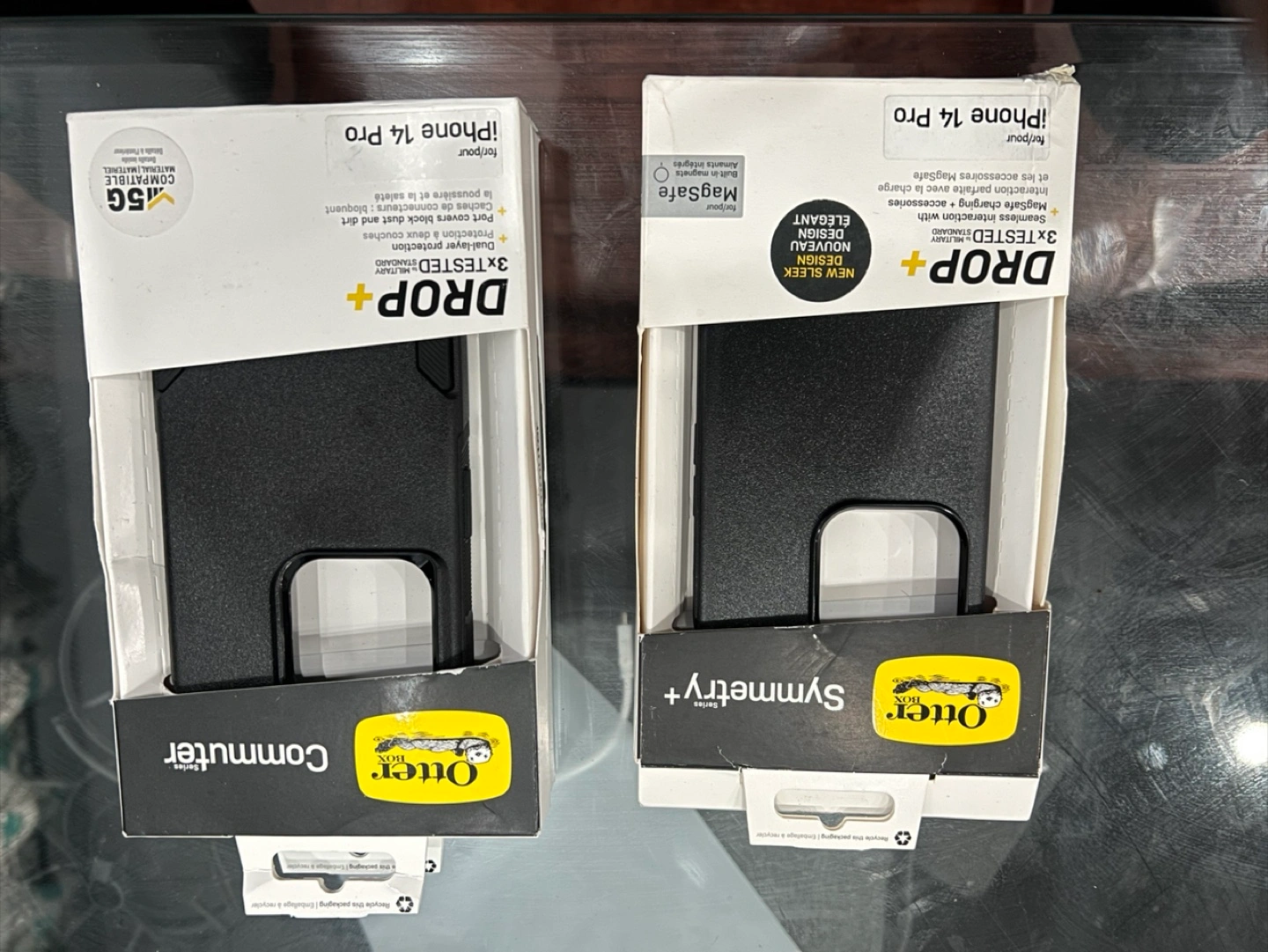 I have two Otterbox cases for the iPhone 14 Pro. One is from the Commuter series and the other is from the Symmetry series. Both are in excellent condition and provide great protection for your phone. They feature a dual-layer protection and port covers to block dust and dirt. The Symmetry series also has seamless interaction with MagSafe charging and accessories, and a new sleek design.