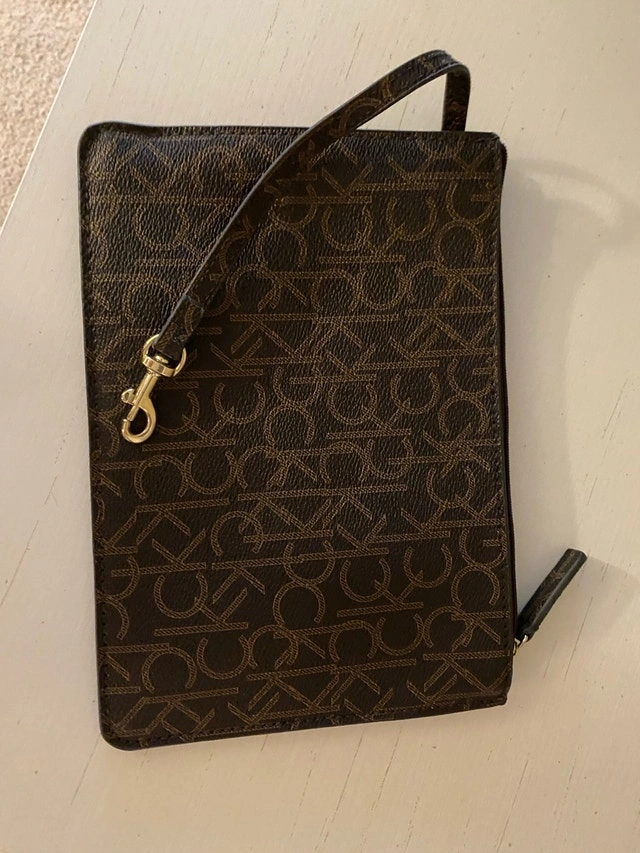 Elevate your essentials with this Calvin Klein wristlet, featuring a stylish monogram pattern. This used wristlet includes a convenient wrist strap and secure zip closure, perfect for keeping your valuables close at hand. * Brand: Calvin Klein * Colour: Brown/tan * Features: Wrist strap, zip closure This cute wristlet is looking for a new home. Don't miss out—if the ad is up, it's still available!
