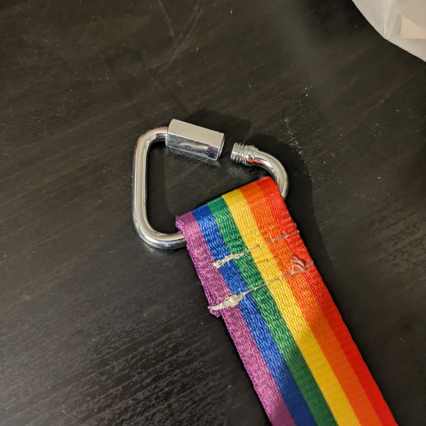 This leash is rainbow on both sides and made of a tough nylon. It has a single non-adjustable hand strap and a triangular metal hook. You could also replace the existing metal clip with a better carabiner or similar if you wanted.