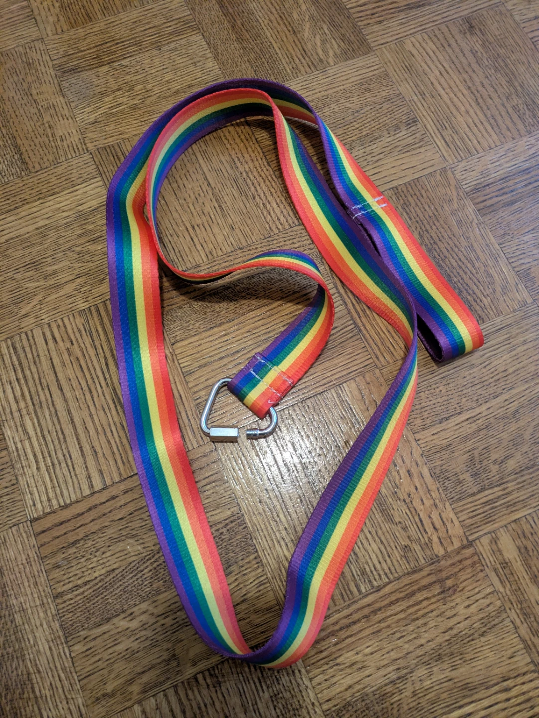 This leash is rainbow on both sides and made of a tough nylon. It has a single non-adjustable hand strap and a triangular metal hook. You could also replace the existing metal clip with a better carabiner or similar if you wanted.