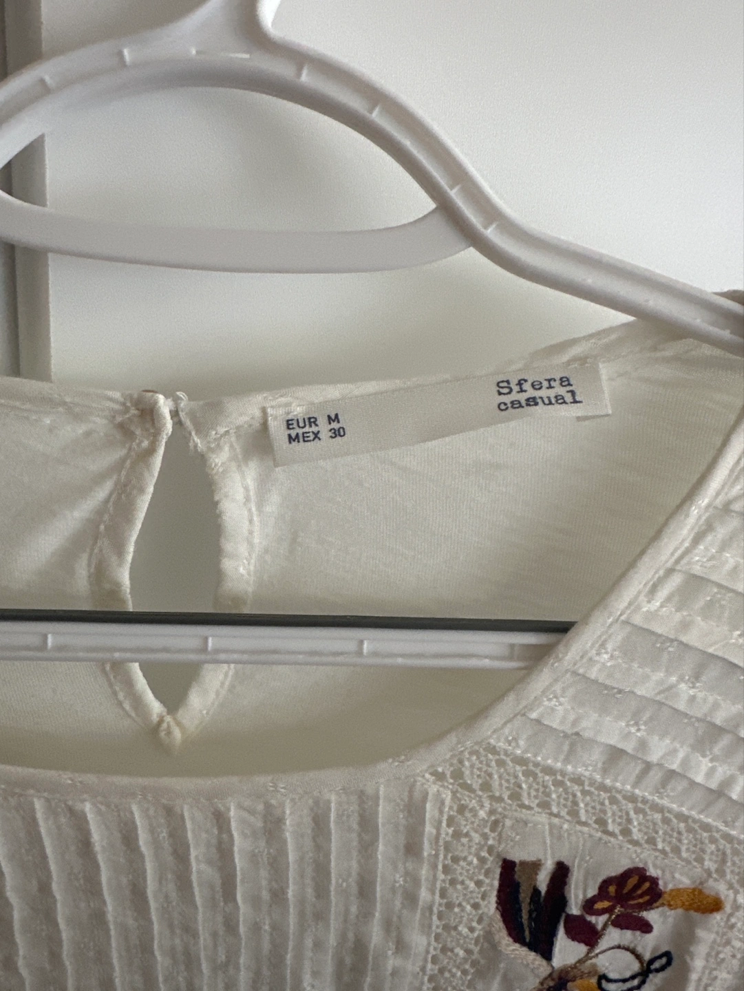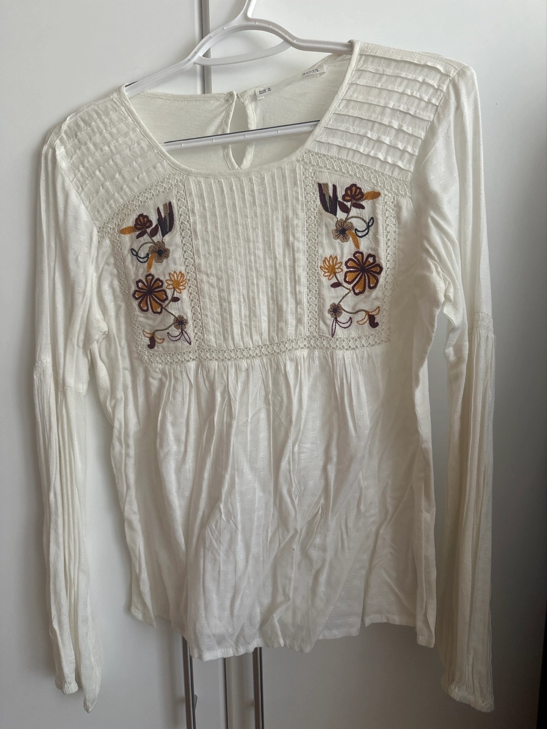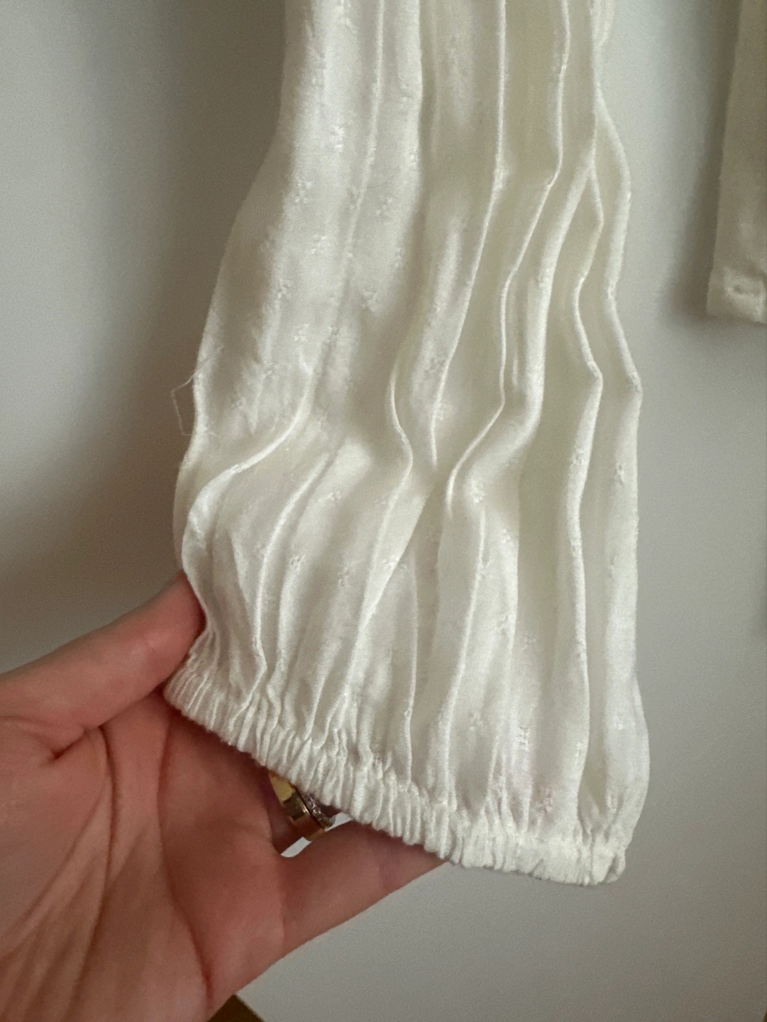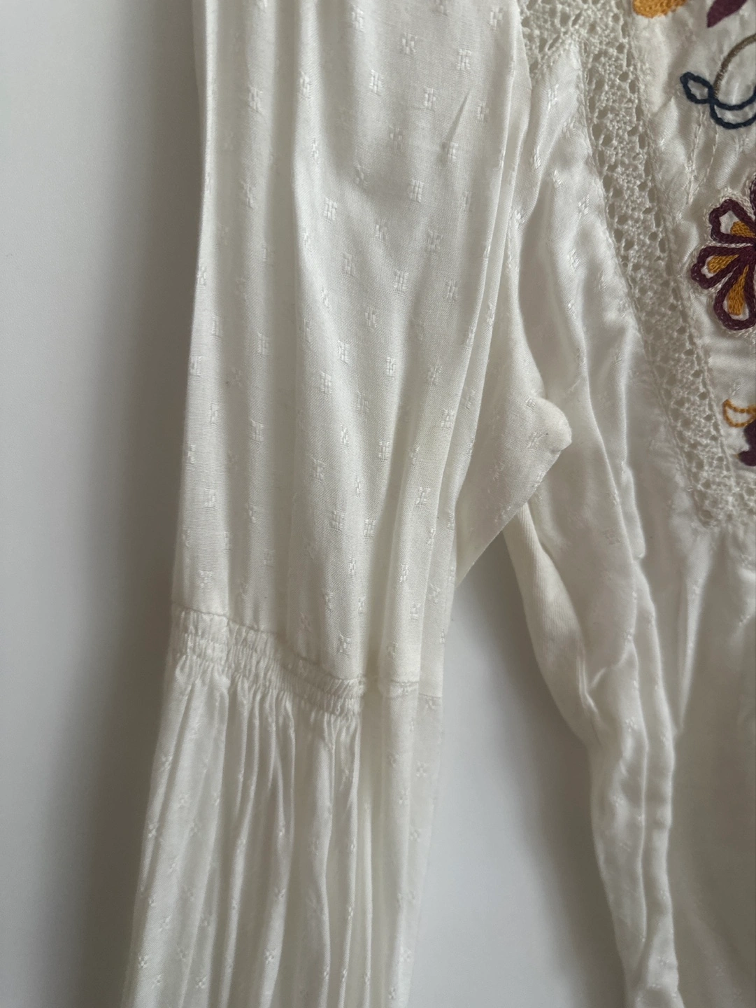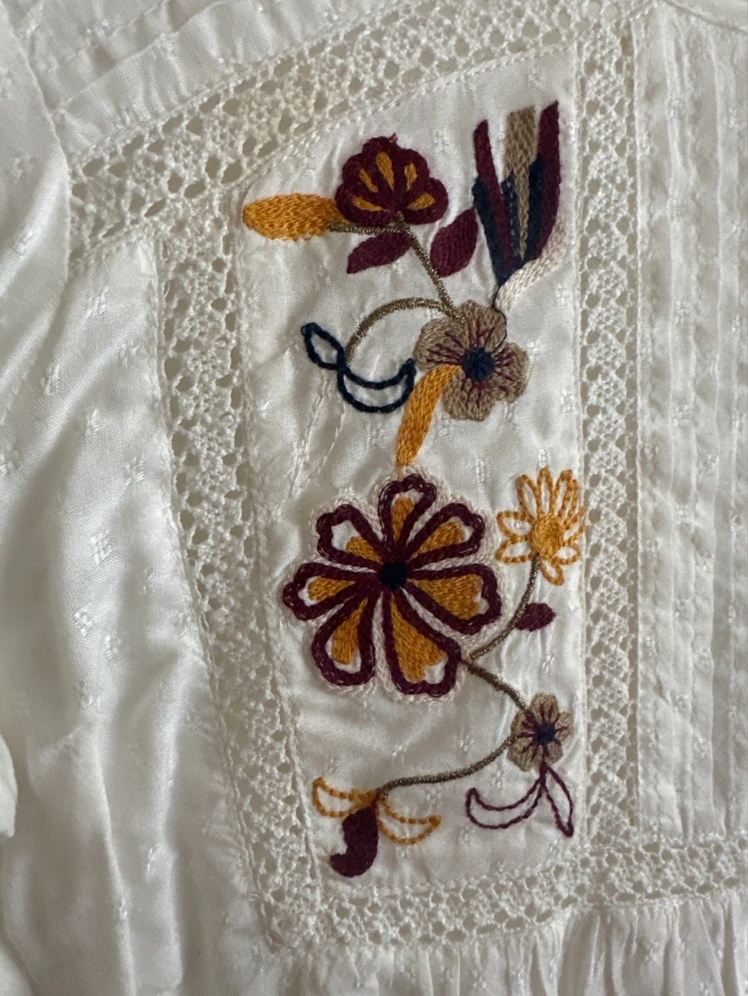 White embroidered long-sleeve blouse. Size medium. Features floral embroidery and lace detailing. Slightly pleated at the neckline and cuffs. Lightweight fabric.