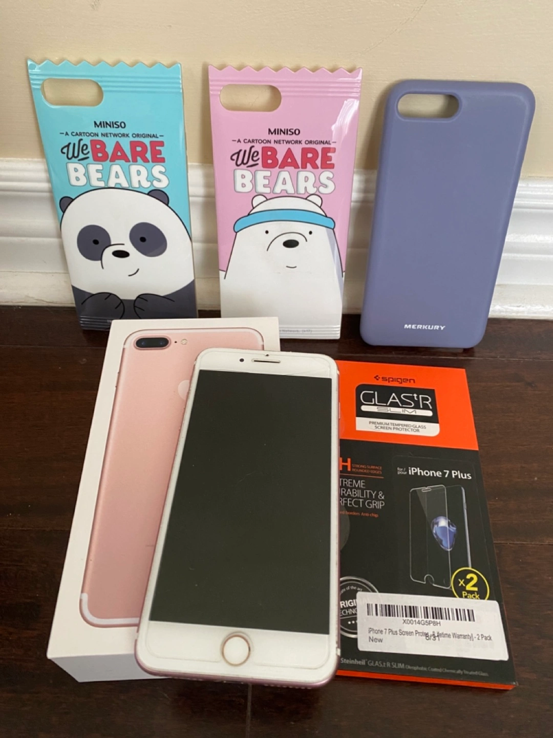 Selling an iPhone 7 Plus in rose gold. It comes with a Merkury case (purple), two We Bare Bears cases from Miniso, and a Spigen Glas.tR screen protector. Battery health is at 70%.