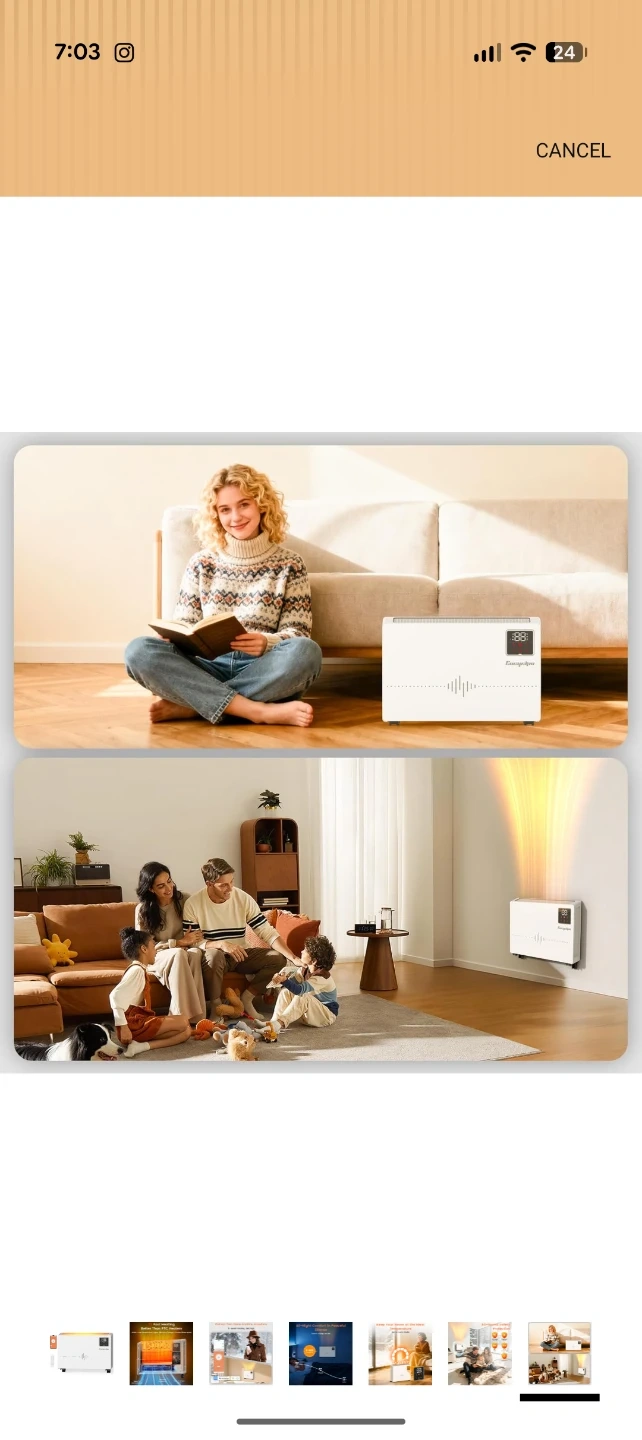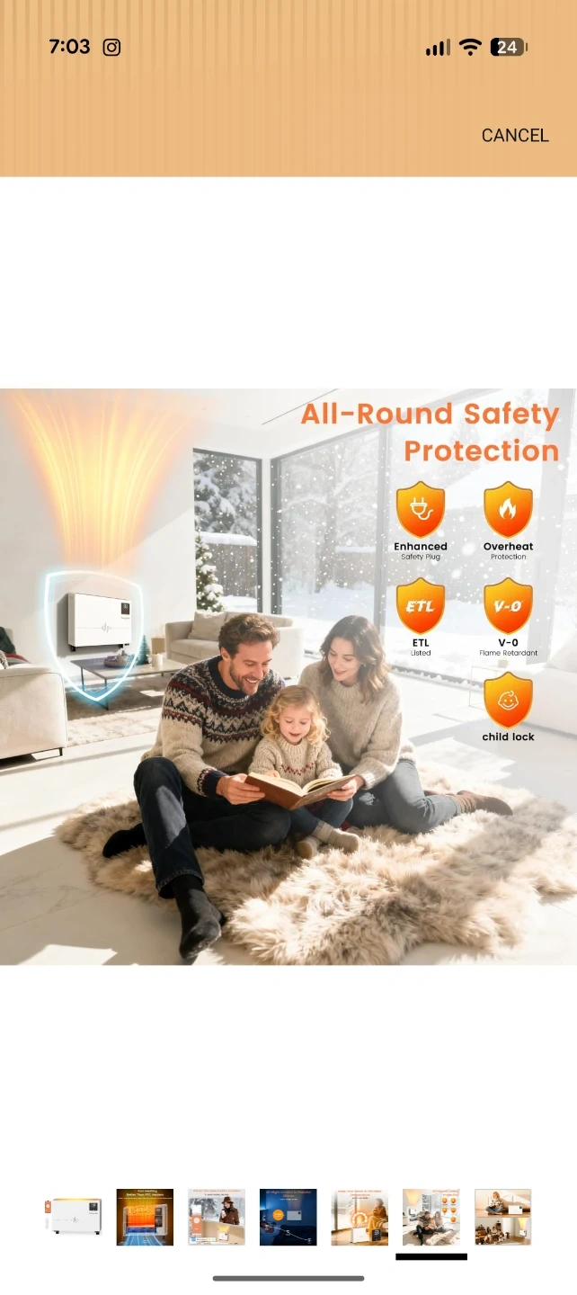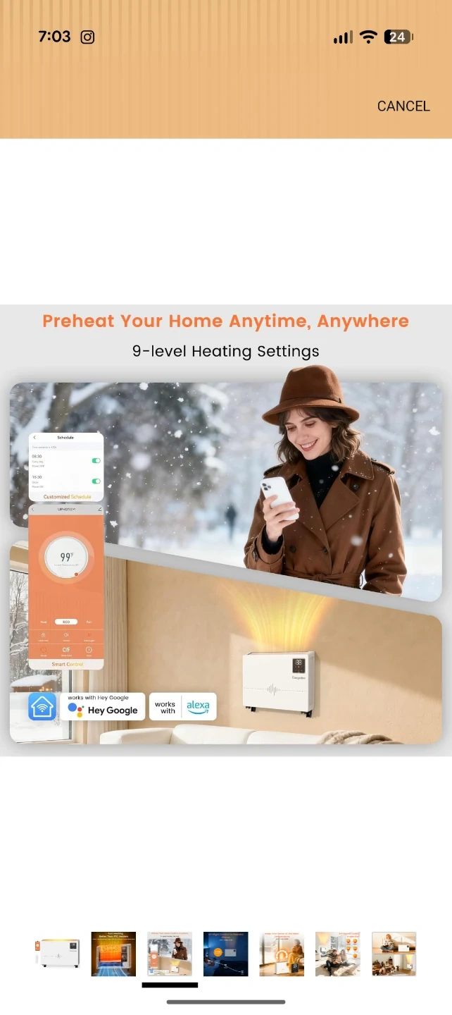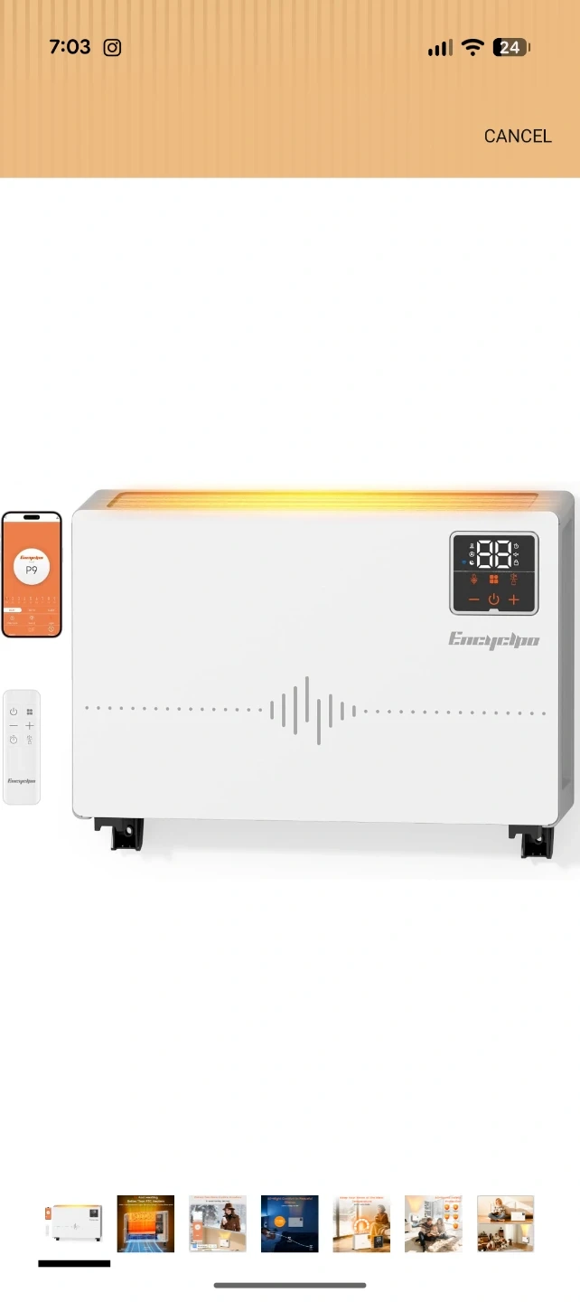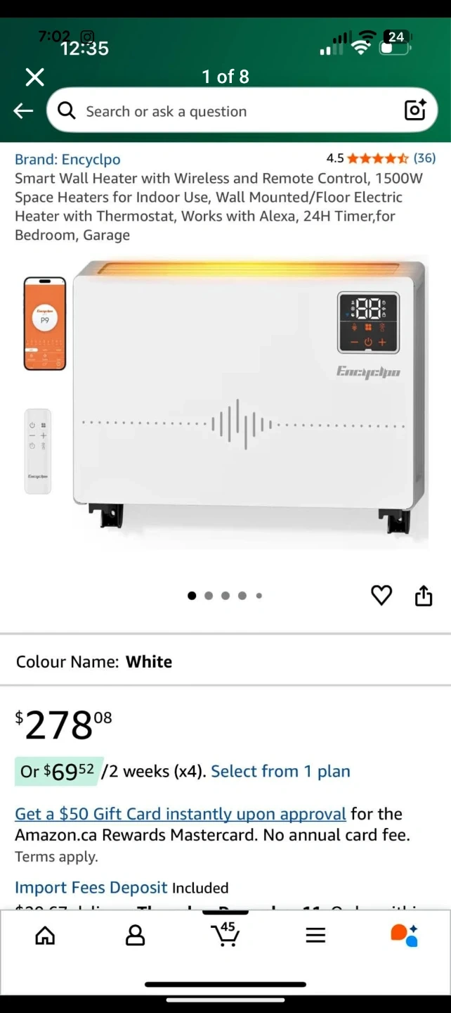 This white Encyclpo electric heater offers quick heating with 1500W power. It features 9-level heating settings and a 0-24H timer for convenience. It's whisper quiet and includes a remote and app control.