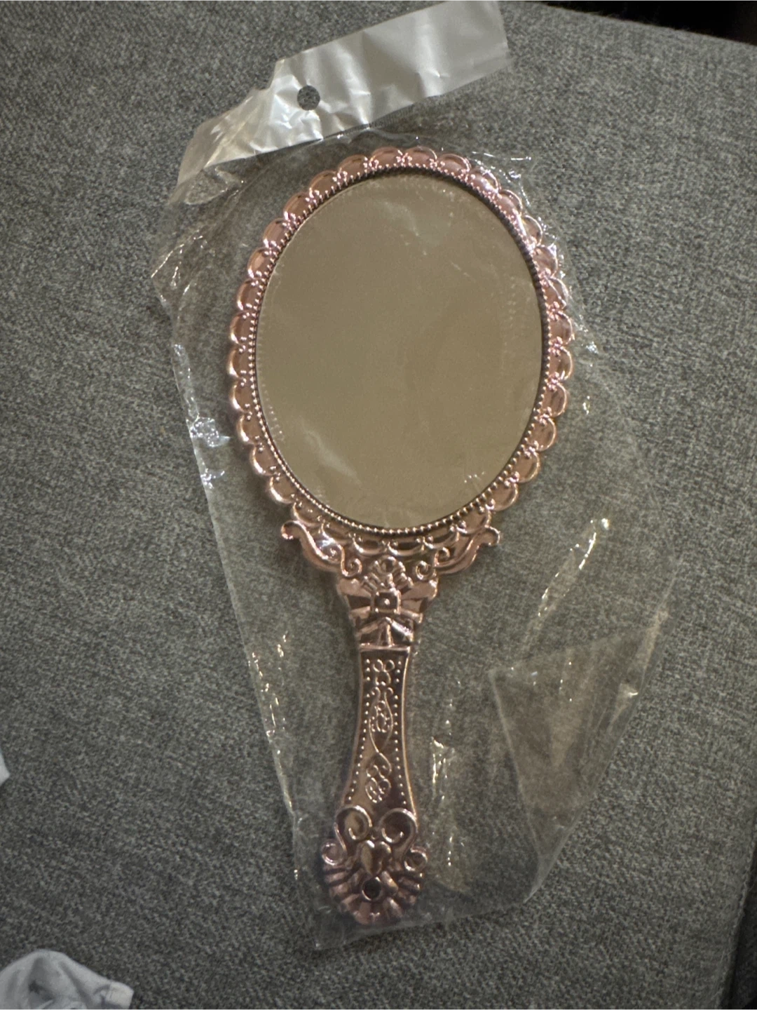 This is a handheld mirror with a vintage-inspired decorative frame. It's a pretty rose gold color and comes in its original packaging. The mirror itself is clear and functional for quick touch-ups.