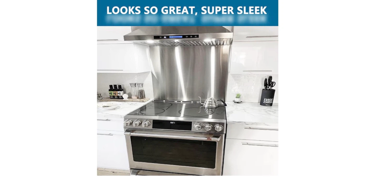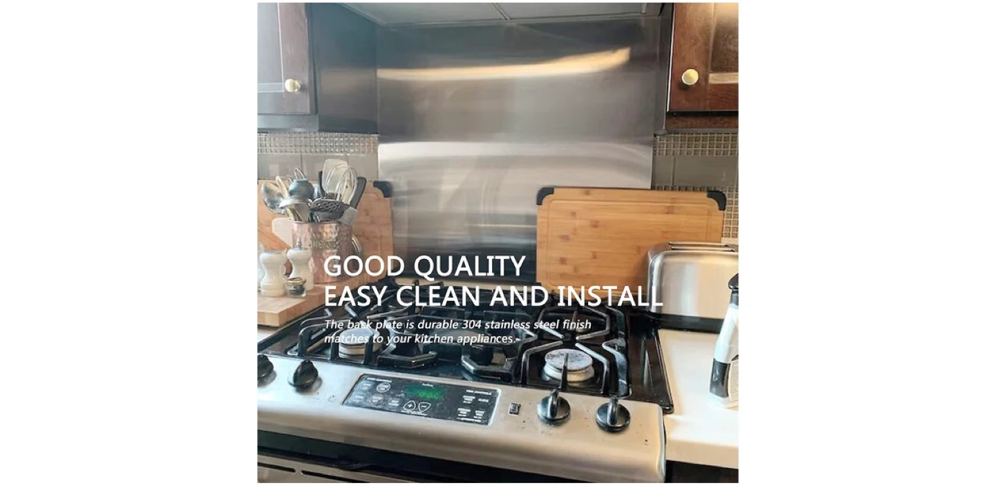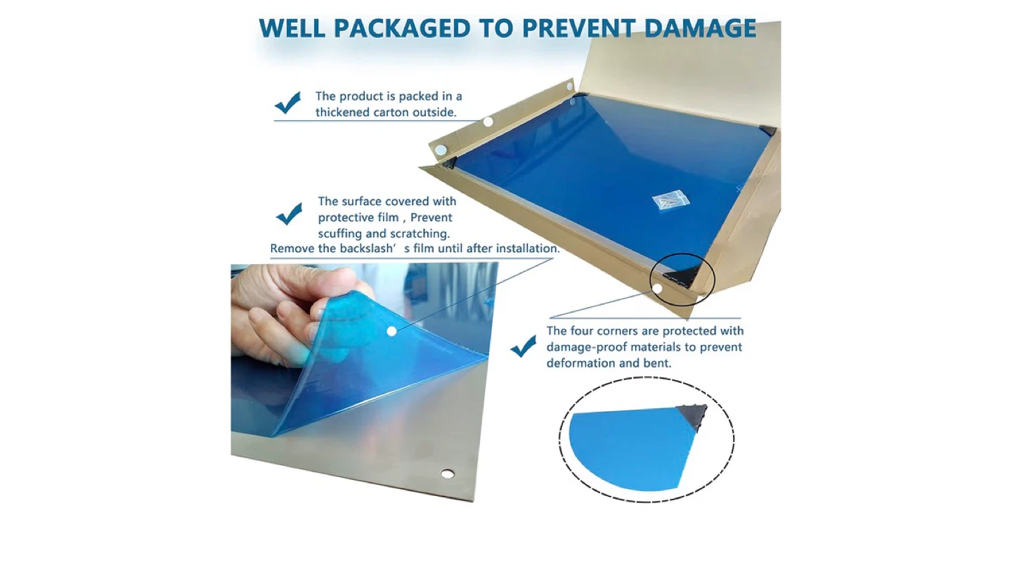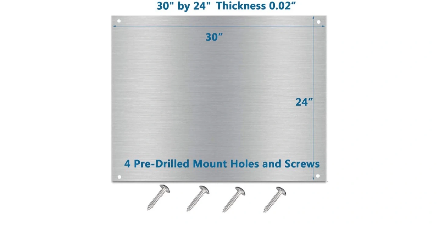 Brushed stainless steel backsplash panel, 30" by 24". Thickness is 0.02", made of 304 stainless steel. Comes with 4 pre-drilled mount holes and screws. The surface is polished and free of burrs, offering a smooth feel. This panel is well packaged with protective film to prevent damage during shipping.