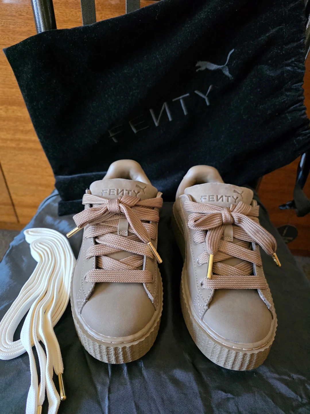 Puma x Fenty Creeper sneakers in a tan color. Features a thick platform sole and includes extra white laces with gold tips. Comes with a black velvet drawstring dust bag.